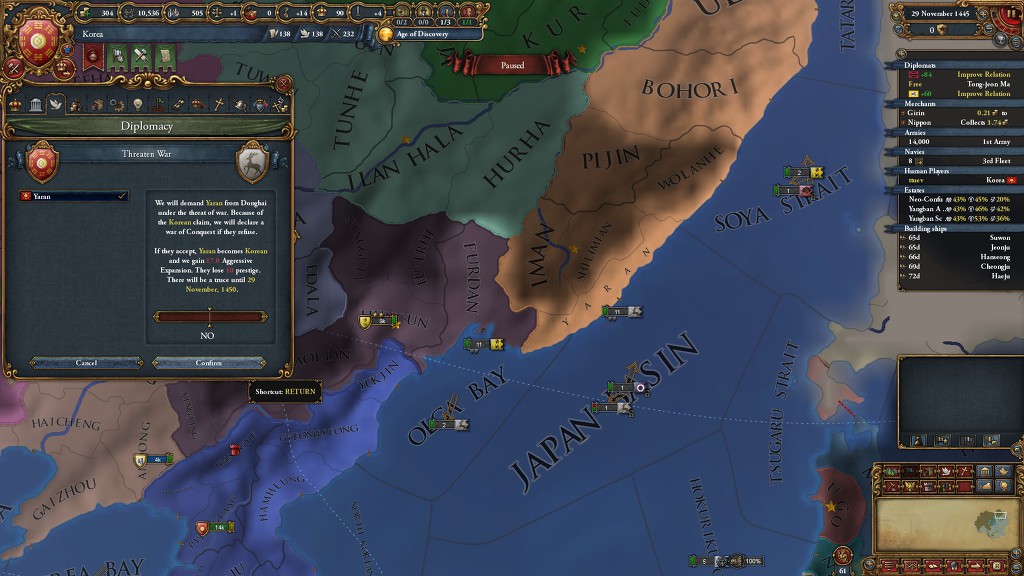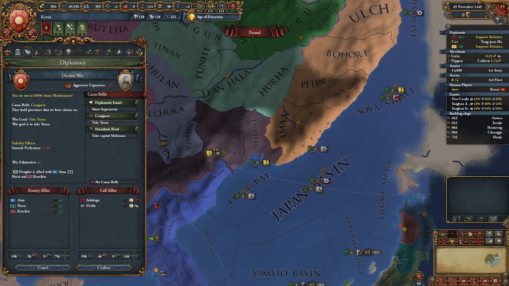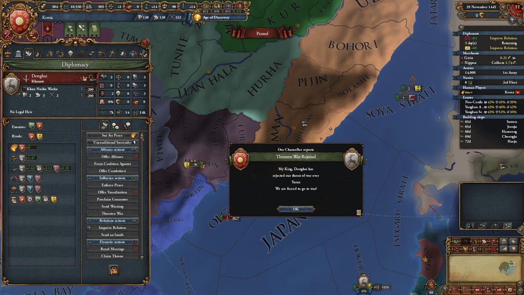 동맹 호출은 이후에 가능해지니, 미리 보고 전쟁위협을 거는 것을 추천합니다.