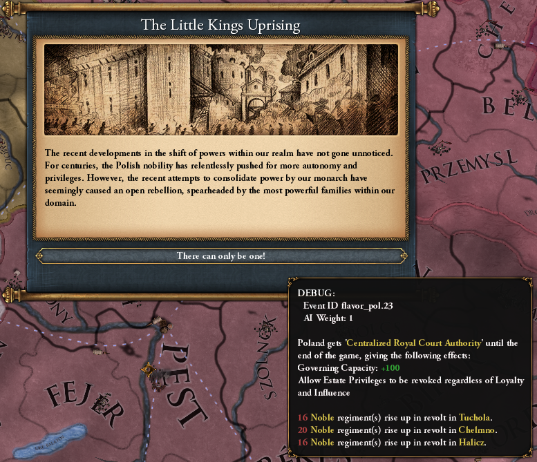 이때 능력치가 하나라도 2 미만인 지도자가 즉위하면 팍타 콘벤타가 뜨기 때문에 귀족에게 반대하는 분기는 1615년까지 미뤄진다