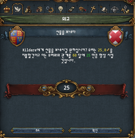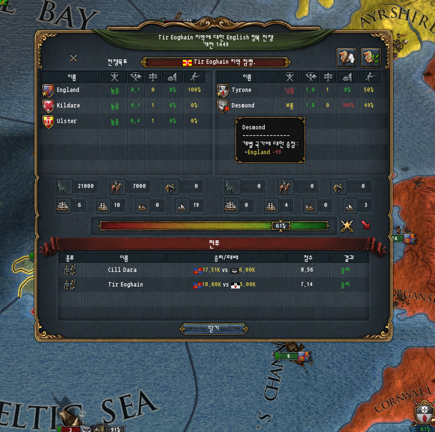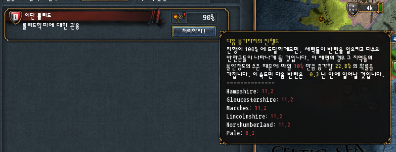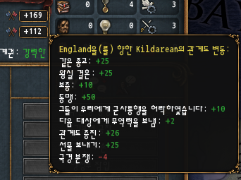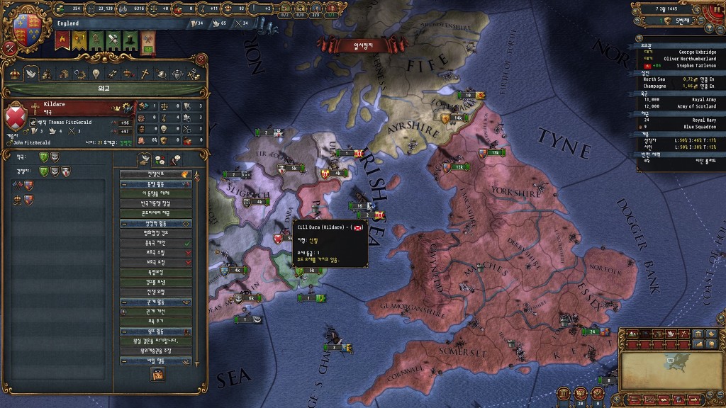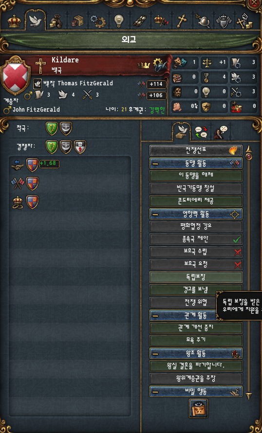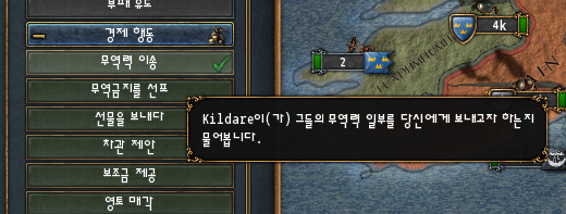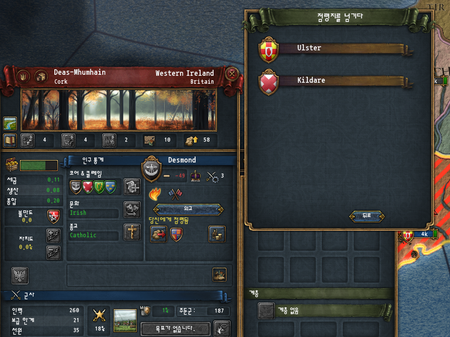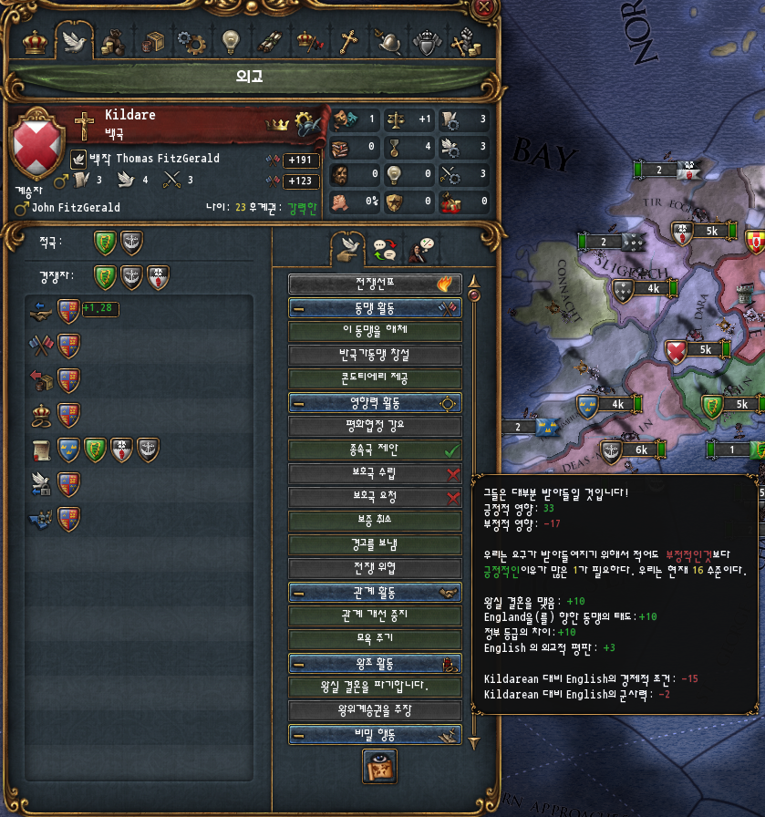 아일랜드쪽에 잉글랜드 땅이 하나 있는데, 왼쪽에 킬데어 백작령과 북쪽의 울스터 백작령을 동맹맺습니다. 그리고 관계개선을 돌려서 관계도 +190을 만들고 종속국을 만듭니다. 왜 두 국가인지는 후일 정복 방향을 보시면 이해할겁니다.