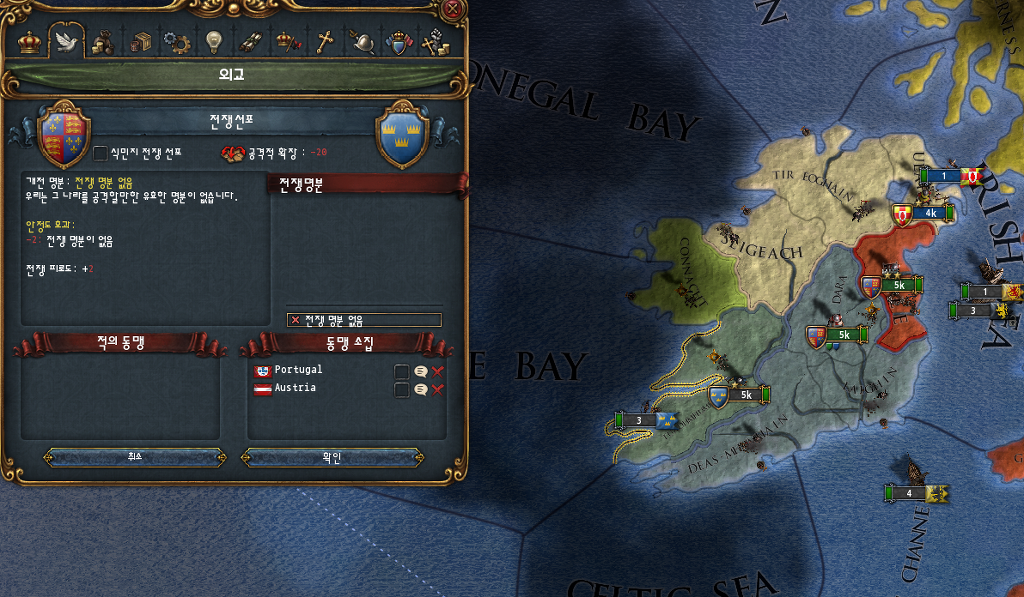 제 속국이 클레임을 걸 때까지 기다립니다. 만약 끝까지 안건다면, 나중에 외교합병하고 난 후에 정리해도 늦지 않습니다. 어차피 저 둘은 더 이상 저에게 위협이 되지 않습니다. 아일랜드는 사실상 평정한 것이나 다름없습니다.