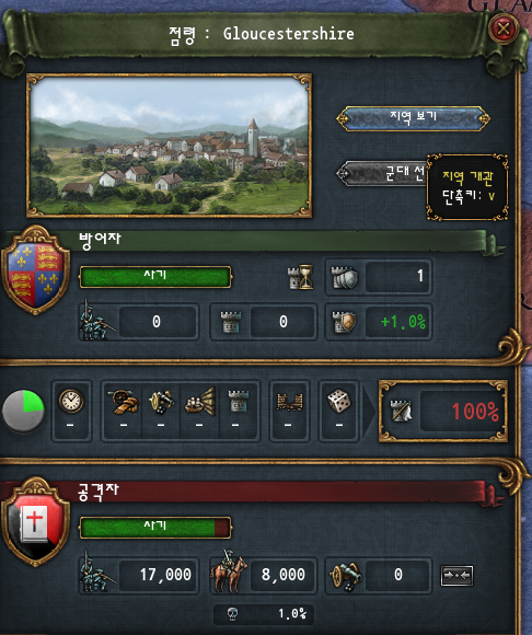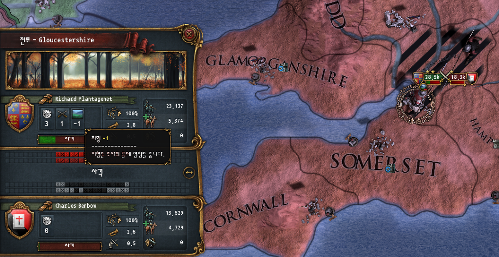 그리고 그림을 클릭하면 지형 정보가 나옵니다. 공격자의 주사위 컨트롤 -1이 있군요.