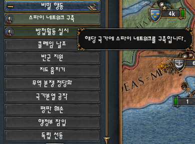전쟁걸고 싶은 국가의 외교창(해당국가의 영토를 우클릭하면 나옴)을 열고, 비밀행동에서 스파이 네트워크 구축을 실시합니다.