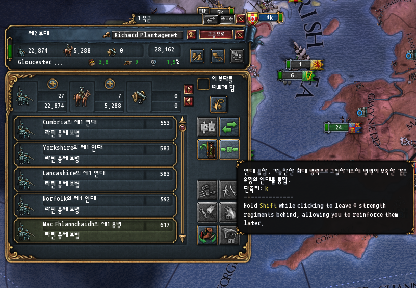 전투가 끝난 후 제일 먼저 해야 할 게 있는데, 연대통합을 합니다. 단축키는 k입니다.