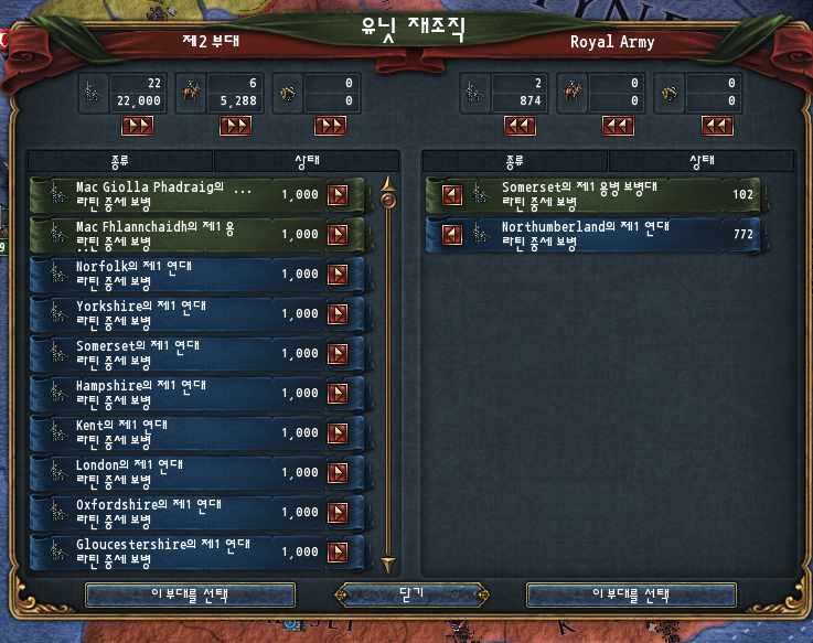 아까 말했던 연대통합과 손실병력 분리를 합니다. 그리고 병과가 보병인 경우에, 그 보병이 정규군이면 과감하게 삭제합니다.