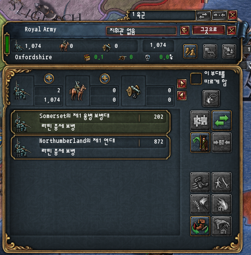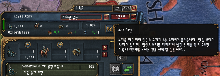지휘관 없음 글씨 옆에 부대 해산이 있습니다. 해산하면 유지비가 깎이고 정규군일 경우 손실부대에 인원보충이 없게 되어 인력유지가 됩니다. 그리고 손실 인원 보충을 위한 유지 비용이 상당합니다. 전황이 유리할 경우에는 저렇게 해서 유지비를 최대한 줄이는게 중요합니다.