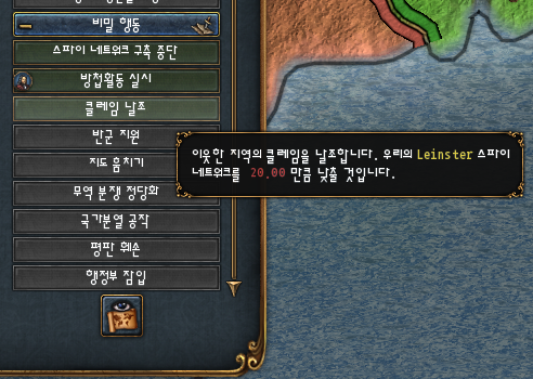 스파이 네트워크는 경쟁국일수록 빨리 구축됩니다. 그러나 leinster는 아일랜드의 작은 소국이므로 스파이 네트워크 구축 속도가 그리 빠르지 않습니다.