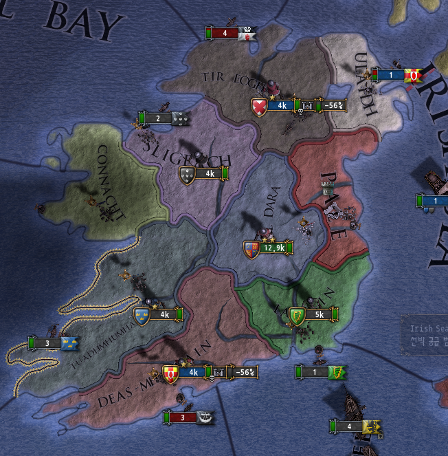 아일랜드를 그대로 내버려 두었다가 아일랜드에 강력한 통일국가 하나가 등장하고 얘네가 스코틀랜드나 다른 강대국들과 동맹을 맺게 되면 골치가 아파집니다. 따라서 소국들로 쪼개져 있을 초반 지금 이 순간에 모두 점령해야합니다.