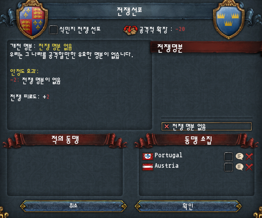 명분없는 전쟁은 안정도를 떨어트리고, 전쟁피로도(염전도)를 늘리며 주변 국가의 반국가동맹(코올)의 대상이 될 수 있습니다. 아무리 강대국이라도 이런 페널티는 나라를 휘청이게 할 수 있습니다. 그럼 전쟁 명분을 어떻게 만드느냐?