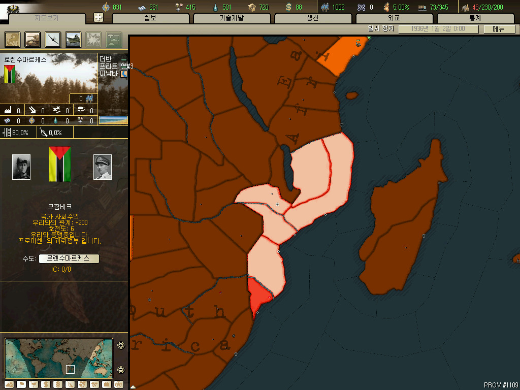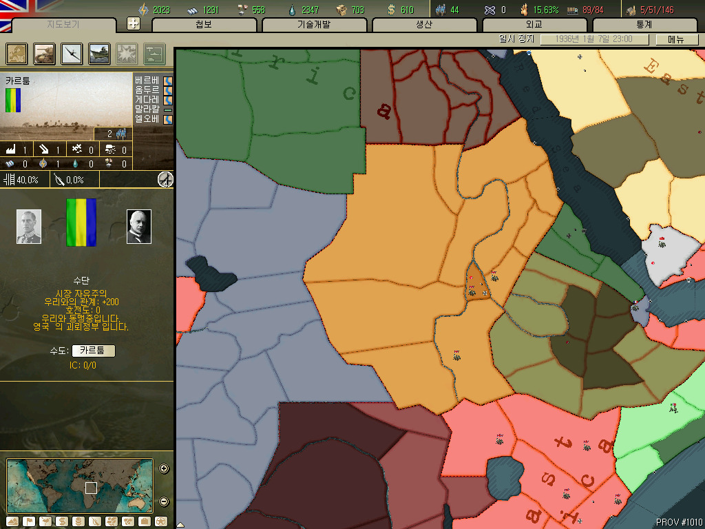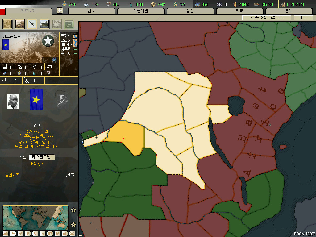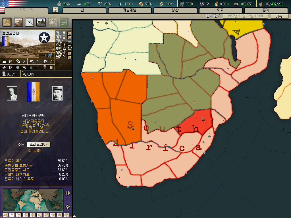 남아프리카 연방입니다. 아프리카에 존재하는 공장이 총 43개인데 그중 20개를 차지하는 아프리카의 강국입니다. (사진의 남아프리카연방의 ic가 80을 넘어가는 건 어비스 시나리오라서 그런겁니다. 합병하고 다시만들기 귀찮아서 예전에 플레이하던거를 사용했습니다.)