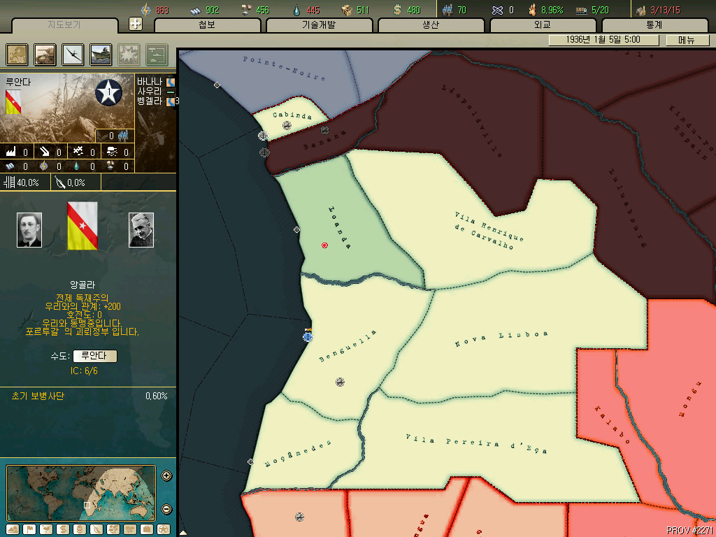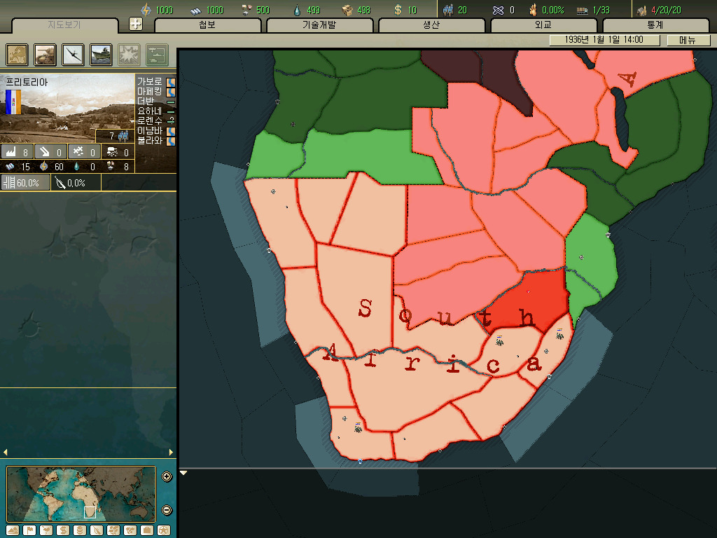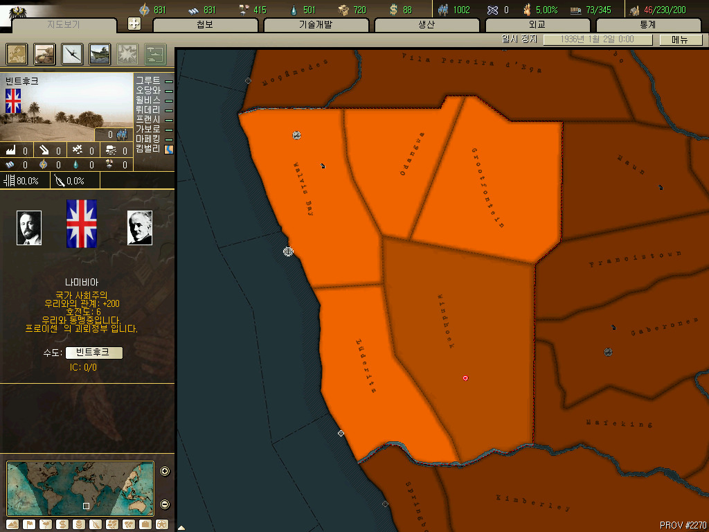 남아프리카 연방의 경우 36년 시나리오를 시작할때 국민지역으로 나미비아도 가지고 있습니다. 다만 다시 독립시키면 나미비아가 국민지역에서 빠집니다. 저 나미비아 지역을 원래 독일의 식민지였는데 1차 대전이후 베르사유 조약으로 넘겨받은 거라는 군요.