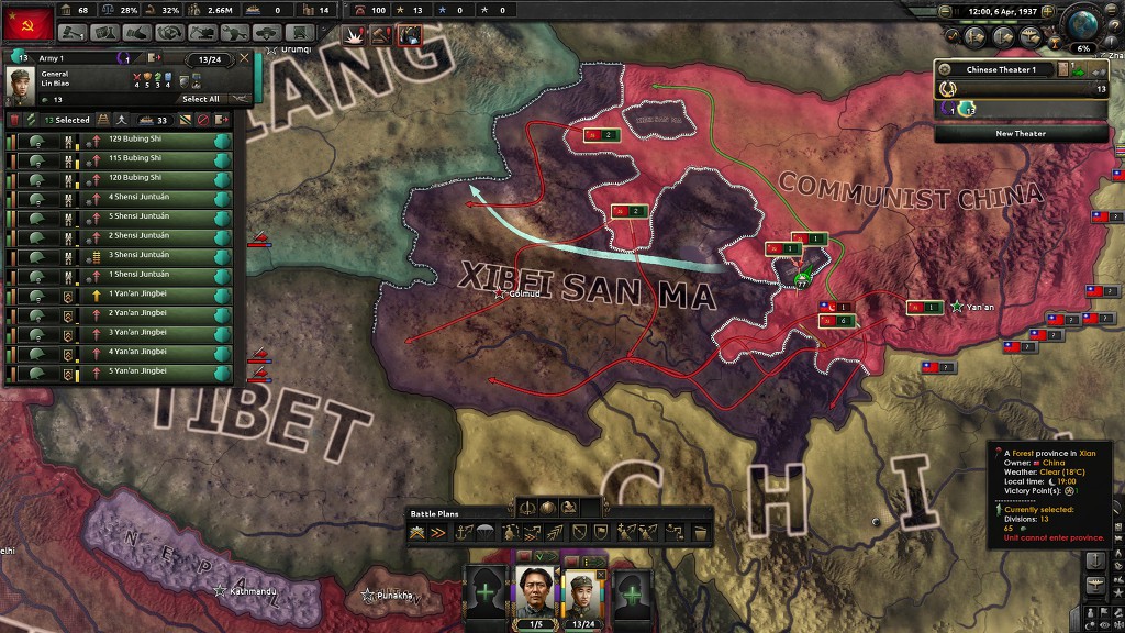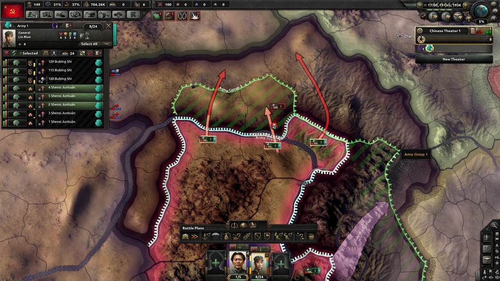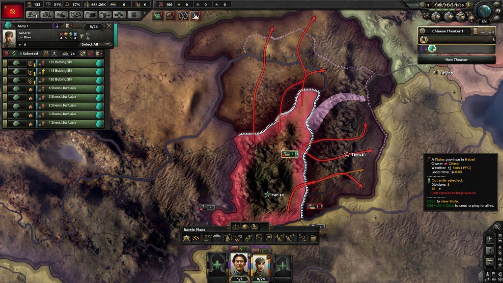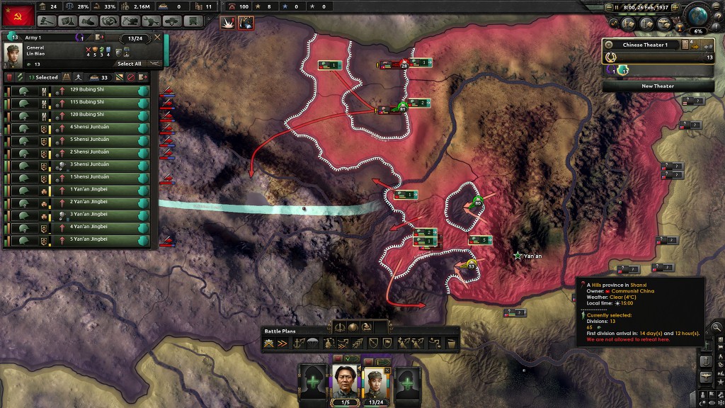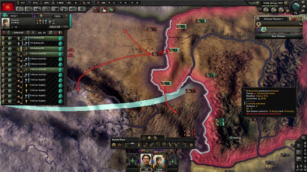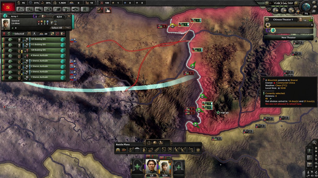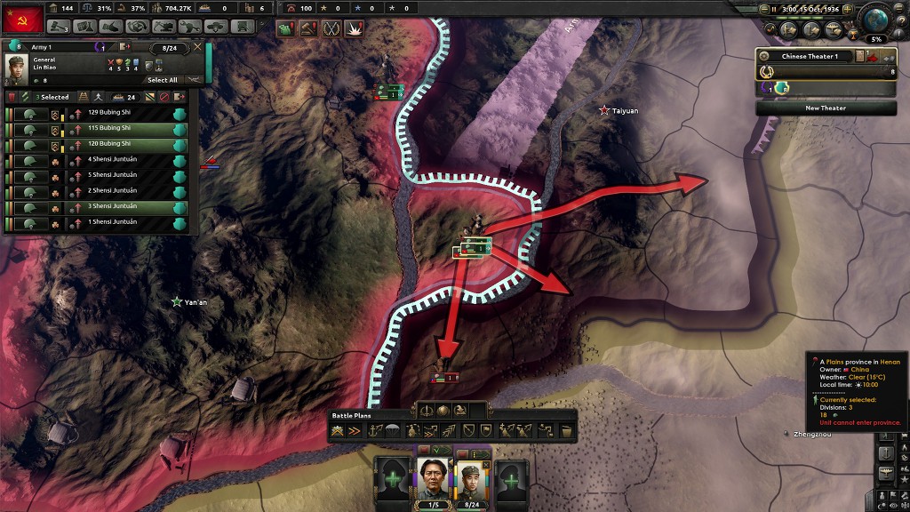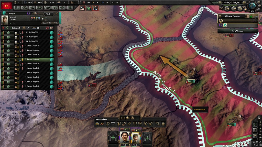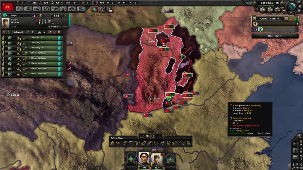 1936년 10월이 되면 포커스가 찍힐 겁니다. 그 전에 미리 배틀플랜 그어두는 거 잊지 마시고, 찍히자마자 바로 선전포고 합니다. 선공은 산시군벌 쪽이 좋습니다. 산시군벌은 땅이 상대적으로 좁고 전방위에 강이 흐르고 있기 때문에 병력이 늘어나면 자칫 강을 낀 채로 교착상태에 빠질 수 있거든요. 개전하면 스샷처럼 멀찍이 찍어서 빠르게 강너머에 교두보를 확보하는 게 중요합니다.