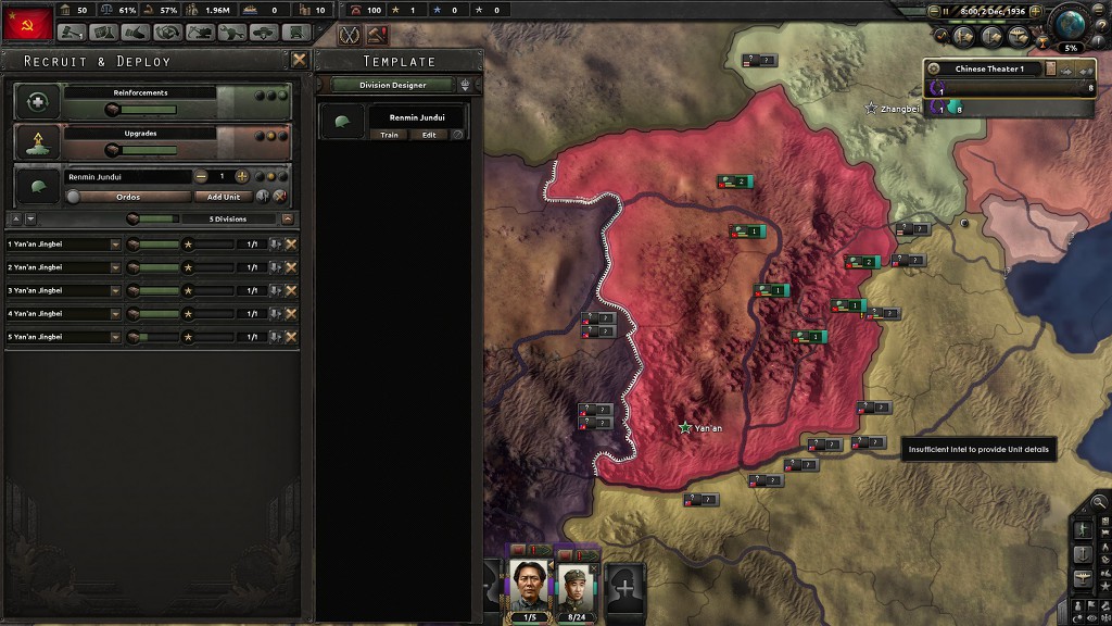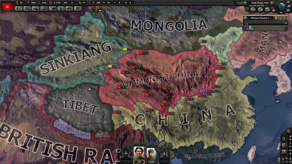 중국공산당 굉장히 어려운 국가죠. 시작해보면 땅은 달랑 하나에 자원도 없고 인력도 부족하고 각종 디버프까지 붙어있는 총체적 난국입니다. 이런 국가로 중일전쟁에서 승전한 뒤 장제스의 국민당과 내전까지 치러야 합니다. 그렇기 때문에 처음 주어진 조건을 그대로 유지한 채로 계속 플레이하면 아무리 출중한 실력의 고인물이라도 내전까지 이기기는 쉽지 않습니다. 제가 저번 달에 HOI 게시판에 중공 관련글을 남겼었는데 그 글에서 트라이했던 중공은 중일전쟁은 이겼으나 내전에서는 압도적인 병력차로 순식간에 지도에서 삭제되었습니다. 침투 디시전을 꾸준히 눌러준다면 산둥 허베이 등을 장악해 중화민국 영토를 남북으로 양분할 수 있으나 병력차가 많이 난다면 수명이 조금 늘어난 것 외에 아무런 의미도 없습니다.