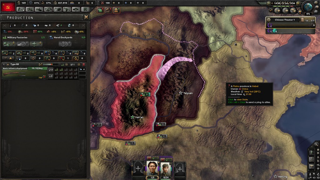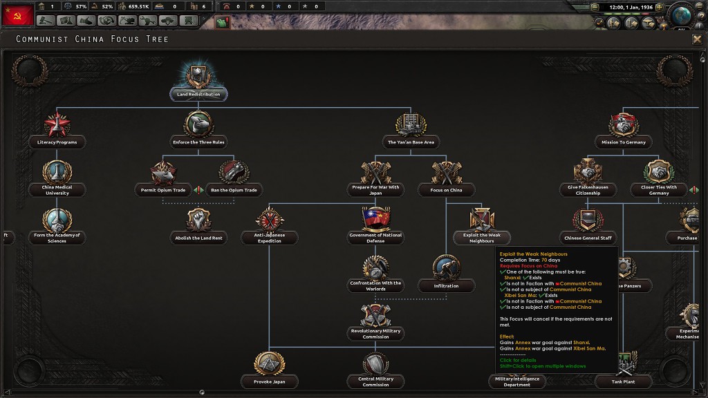 2. Infiltration (침투) 포커스를 빠르게 찍은 뒤 중일전쟁 내내 쿨타임 찰 때마다 꾸준히 디시전을 눌러주셔야 합니다. 각 지역별로 여러번 공작을 펼칠 수 있는데 단계별로 공장 및 인프라 사보타주 -> 해당 지역 점령 -> 점령 및 밀리샤 소환이 가능합니다. 부지런히 한다면 내전 터지자마자 5~6개 지역을 공짜로 먹고 시작하는 건데 굉장히 메리트가 크죠. 중일전쟁 대세가 기울었다 싶으면 최전방에서 병력빼거나 공세 안 하고 일부러 종전 늦추면서 침투작업 하시면 좋습니다. 내전 끝날 때까지는 중공은 눈치밥 잘 먹어야 합니다.
