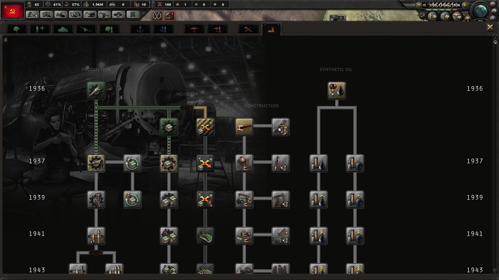 기술은 아웃풋과 생산 효율성을 늘려주는 산업을 최우선으로 연구합니다. 건설 속도는 지금 시점에서는 의미가 없습니다. 그리고 보병장비와 육군교리도 꾸준히 연구해주세요.