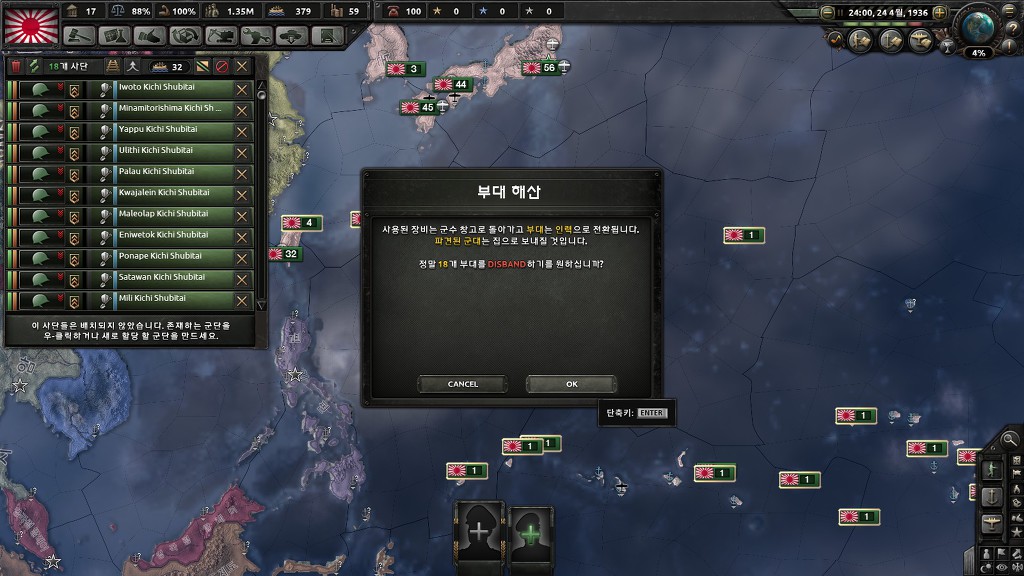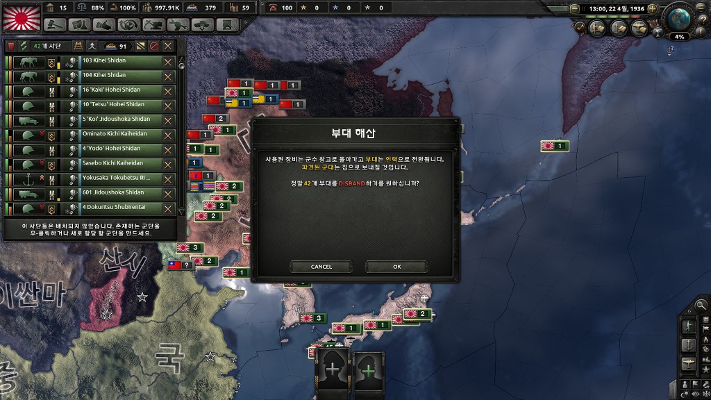 기존 일본제국은 기본병력이 존재한다는 가정하에 별로 안주는 반면, 공산주의 일본은 14개 사단을 제공해줍니다.