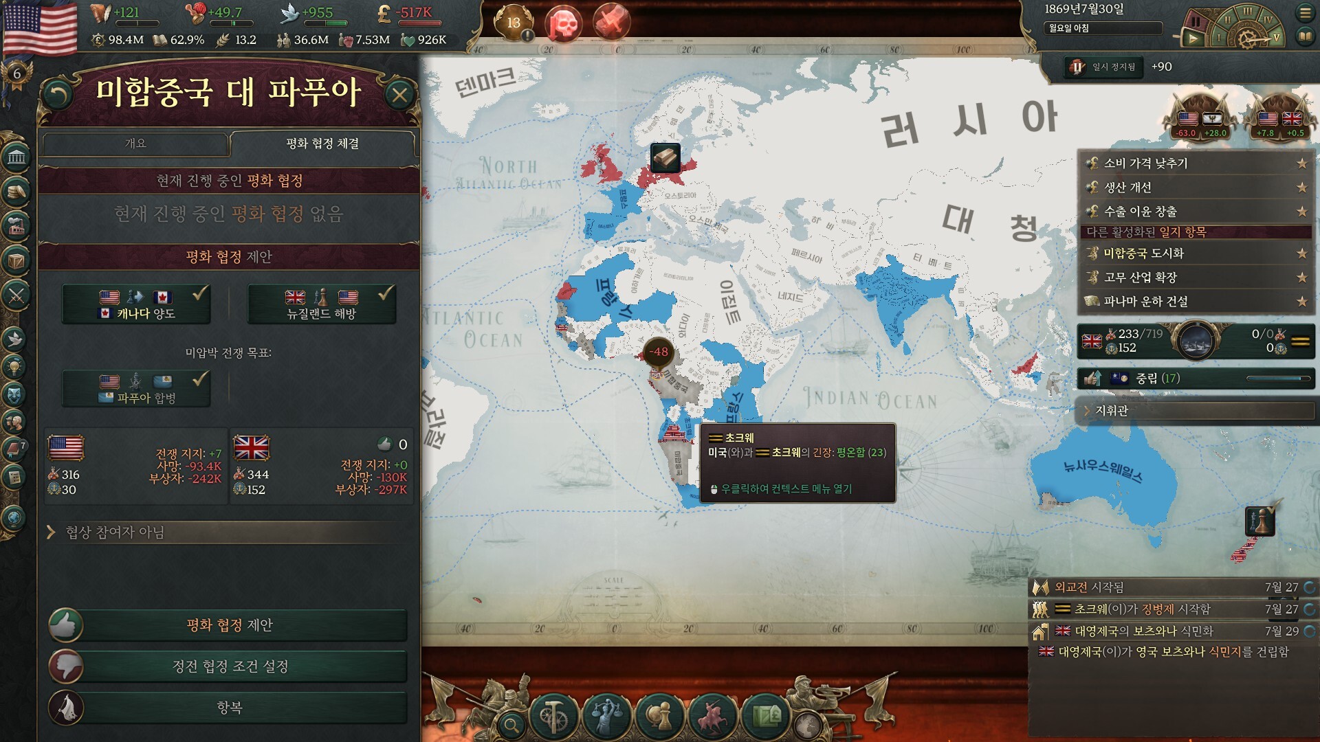 7.악명 50 넘지 않는 선에서 아메리카 국가들을 아래로 내려가며 하나씩 자치령 만드시면 됩니다.