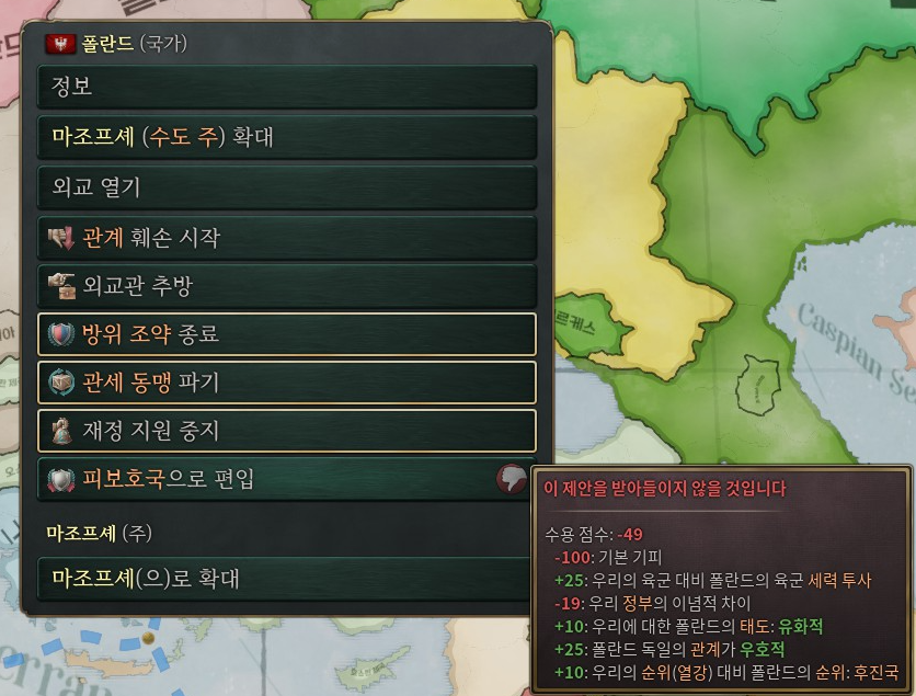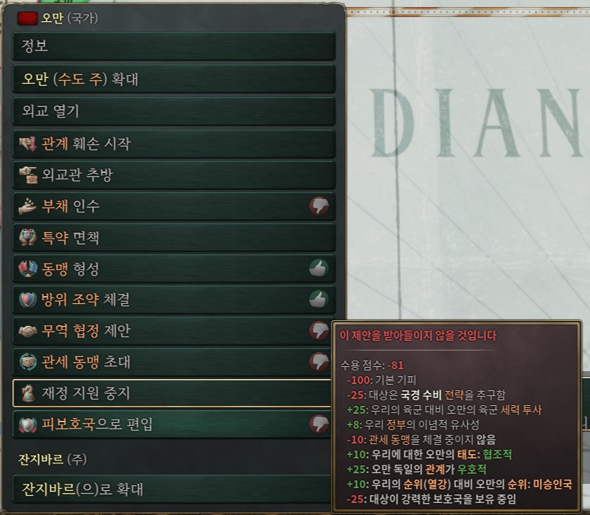 부채 탕감이나 재정지원으로 특약을 얻어놨다면, 특약을 사용해서 피보호국으로 편입이 가능한 상태이다