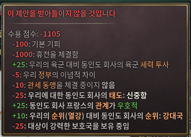 - 영국 동인도: 해방시켰다면 관세동맹-피보호국이 가능하지만 태도가 안좋으면 불가능한데 랜덤이라는게 문제다. 승인 강대국일때 괴뢰화하면 악명 180이 쌓인다..