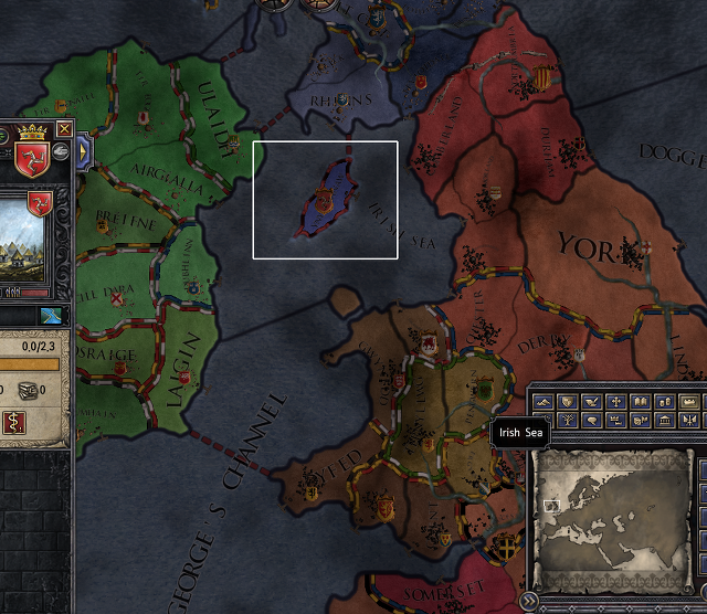 우선 서유럽의 잉글랜드입니다. Manaw 공작령이죠. 잉글랜드의 유일한, 백작령 하나 뿐인 공작령입니다. 거기에 입지도 썩 나쁘지 않고 무엇보다 공화국 반란을 엄청 쉽게 진압할 수 있습니다. 그냥 배를 타고 상륙하면 됩니다. 다만 아쉬운 점은 홀딩이 적다는 건데 애초에 봉신으로 공화국을 부릴 때는 그런 게 흠이 아니죠. 그보다는 공화국이 내 수도에 무역기지를 박는 게 더 중요합니다. 그럼 직할령 수입이 올라가거든요. 공화국의 넘사벽급인 제노바나 베네치아가 아닌 이상 일반적으로 플레이어는 상업공화국이 벌어다주는 수입보다는 무역기지를 내 중요도시 중에 하나에 박아서 세금을 뻥튀기해주는 걸 노려야만 합니다. 보통 무역기지가 박힌 백작령에는 무역가치라는 가산치로 기본 50% 정도의 세금을 더 받습니다.