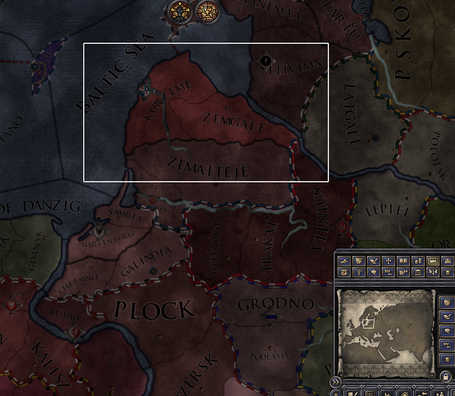 그마나 추천드리는 땅이라면 동유럽의 북쪽, 좀 마이너한 땅인데 제가 종종 공화국으로 삼는 땅 'Curonia' 공작령입니다. 사실 북유럽은 아니지만 그래도 북유럽에 어느 정도는 걸친 땅이죠. 여길 공화국으로 삼으면 발틱 해의 여기저기, 북유럽 등에 무역기지를 박습니다. 폴란드나 리투아니아 왕국, 스웨덴 왕국으로 플레이하시는 분은 덴마크를 노려서 공화국 만들기보다는 여길 점령해서 공화국으로 개발하는 게 좋습니다. 덴마크를 무역기지로 삼으면 쓸데도 없이 영국으로 빠져서 남만 좋은 일을 하는데 여길 무역기지로 삼으면 발틱 해에만 무역기지를 짓거든요.