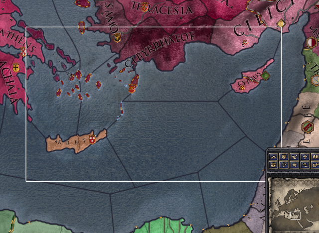 두 섬의 입지를 보세요. 옛날 베네치아도 저기에 상업기지를 세웠죠. 보통 저기 공화국을 박으면 비잔티움보다는 알렉산드리아 방향과 예루살렘 쪽으로 무역기지를 박습니다. 일단 저 두 섬은 홀딩에 적어서 직할령이 두 개나 되는데도 반란 진압이 편합니다. 제노바나 베네치아처럼 백작령 하나로 이루어진 공작령이 아니지만 홀딩 합이 적은 공작령이라 공화국으로 나쁘지 않죠. 어차피 저런 식의 공화국은 두들겨패서 감옥에 가두고 돈을 버는데 존재가치가 있습니다. 공화국에서 벌어들이는 세금도 돈을 벌기에 좋지만 최대한 많은 돈을 받아내는 방법은 바로 몸값입니다. 내 봉신인데 누구 눈치를 볼까요? 파문하거나 음모로 누명 씌우고 두들겨팬 다음에 보석금으로 돈을 버세요. 풀어주고 곧바로 가두세요. 감옥으로 출근하게 만들면 돈은 쉽게 벌 수 있습니다.