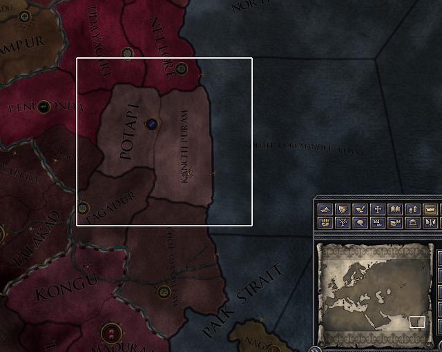 'Kanchipuarm' 공작령입니다. 왜 저길 공화국으로 삼느냐면 반란이 터졌을 때에 가장 진압하기가 쉽거든요. 인도를 하시는 분이 적으셔서 잘 모르실 수도 있어 설명드리겠습니다. 그냥 간단하게 인도는 상비군, 문화, 외모 모두 정이 안 가는 대신 땅들은 죄다 비옥해서 홀딩 다섯 개는 기본으로 있다고 생각하시면 됩니다. 저기 아닌 다른 곳을 공화국으로 줬다가 나중에 반란이 터지면 못 막습니다. 인도에서 일어난 공화국 반란, 이 때와 동급의 절망을 느꼈을 때가 딱 한 번 있었죠. 제가 뭣도 모르고 콘스탄티노블 공작령을 공화국에 줬다가 후에 반란이 터졌을 때가 똑같은 기분이었습니다. 인도 무시하지 마세요, 여러분. 콘스탄티노블? 니케아? 인도는 코끼리들마저도 실크로드의 황금으로 샤워를 하는 나라입니다. 부자나라에요. 가끔 AI가 전륜성왕으로 승천하는데 이러면 몽골 둠스택도 혼자 두들겨팹니다.