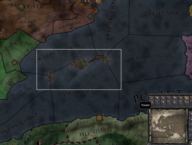 'Mallorca' 공작령입니다. 주로 아키텐이나 (북)아프리카, 스폐인을 하실 때에 공화국으로 만들면 좋습니다. 특히나 아키텐이나 트리폴리를 굴릴 때는 거의 필수죠. 일단 저길 공화국으로 만들면 무역기지를 거의 십에 팔구는 직할령으로 삼는 툴루즈나 튀니지, 바르셀로나에 박습니다. 이 땅들은 플랑드르만큼은 아니어도 남들이 알아주는, 얼마나 잘 알아주는지 기회만 되면 성전을 때리는 꿀땅이라 무역기지가 박히기만 하면 수입이 엄청나게 뻥튀기가 됩니다. 당연 유저가 굴려야 진가를 보는 땅이죠. 개멍청한 AI들은 이 황금땅을 잡고도 삽질만 합니다. 당장 먹자마자 수도로 삼아야만 하는 땅인데 말이죠.