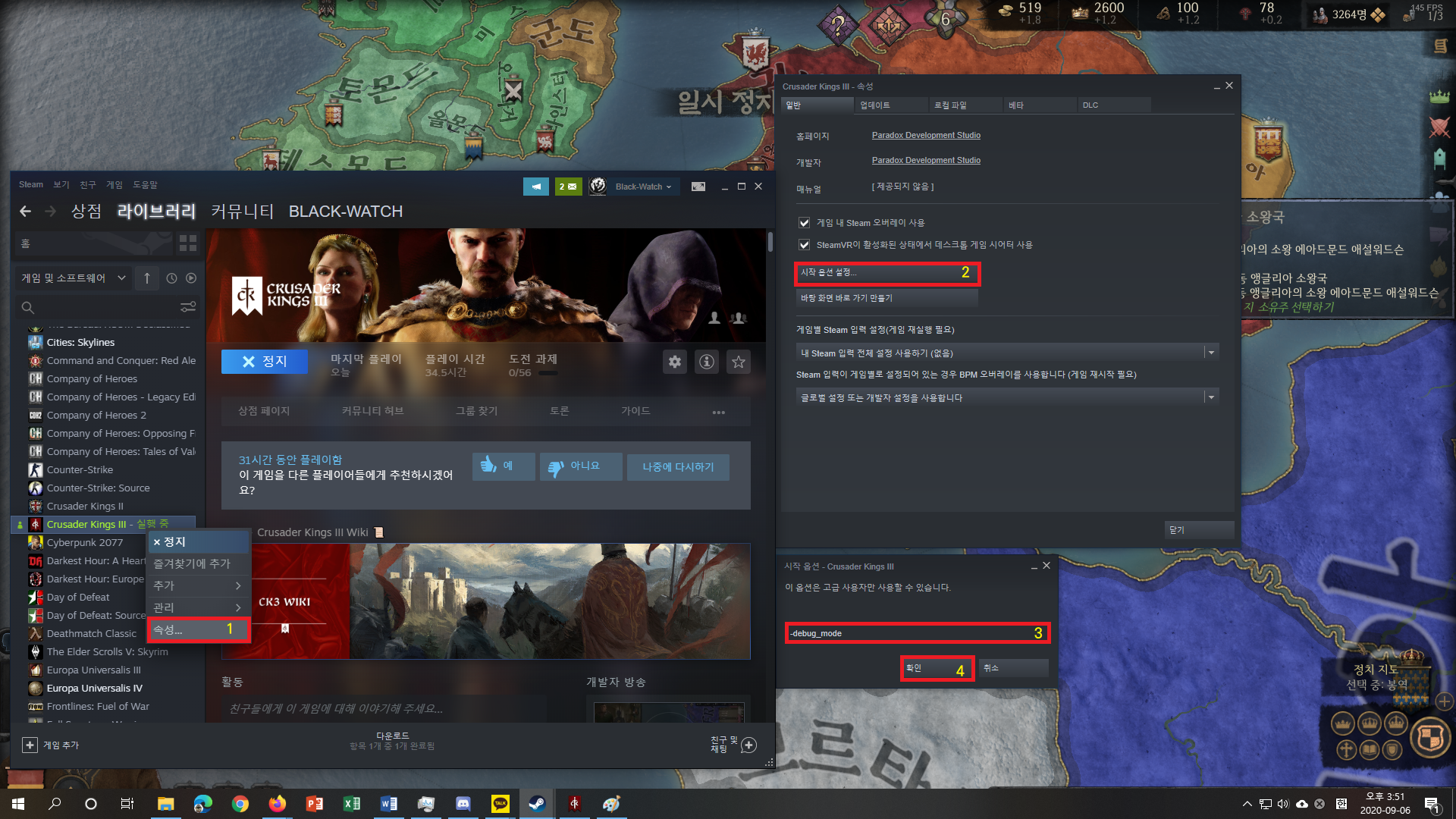 - "-debug_mode" (좌우 따옴표는 포함하지 않습니다) 를 입력창에 넣고 '확인'을 누릅니다.