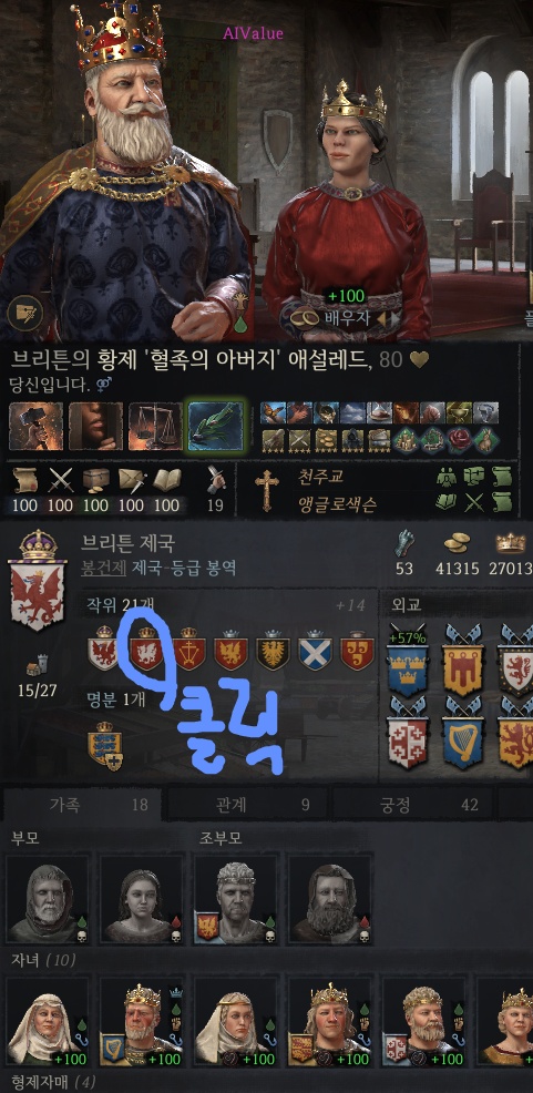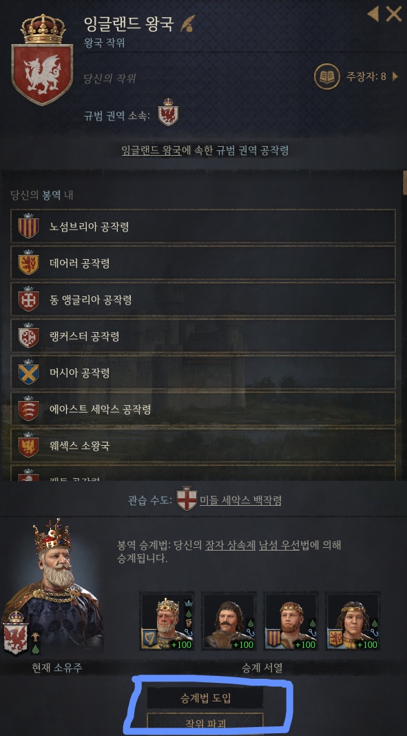 2. 중간에 있는 내 작위 목록에서 승계법을 바꾸고자 하는 작위의 문양 클릭