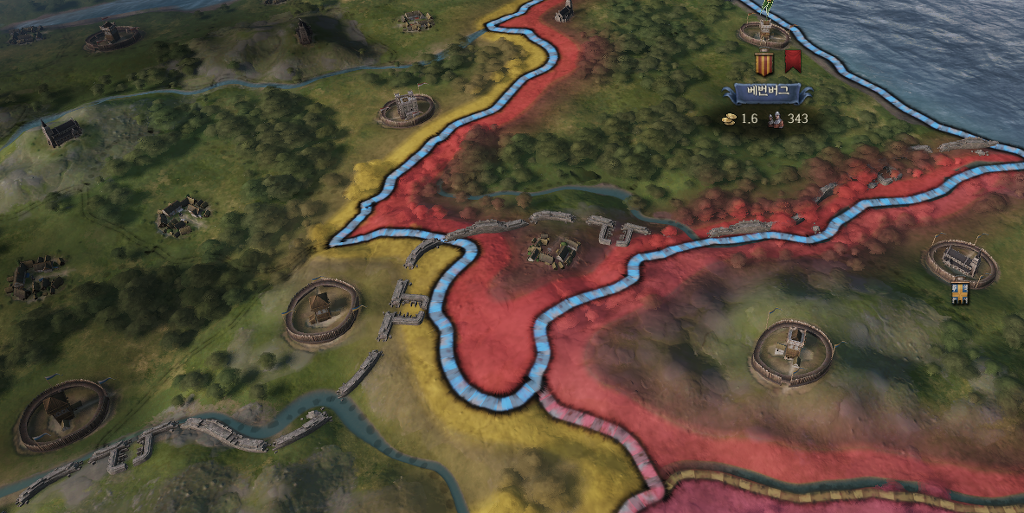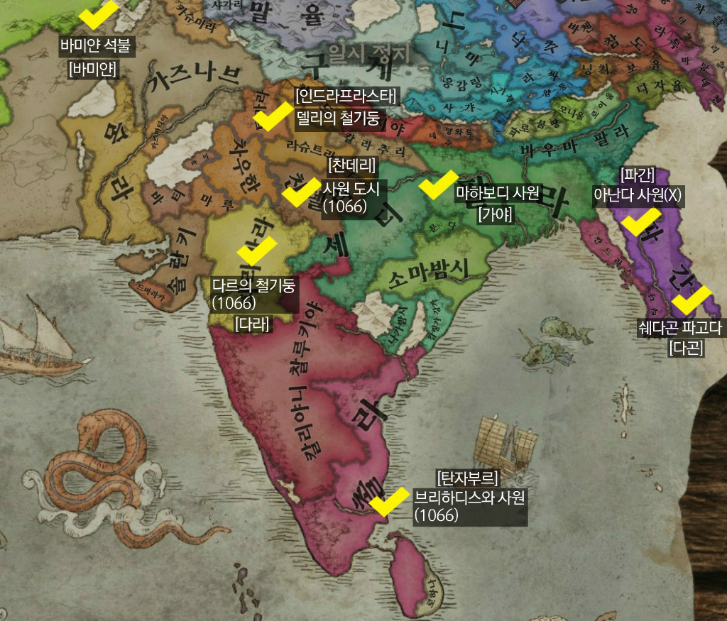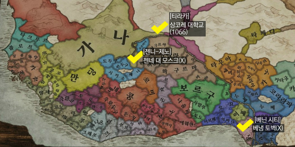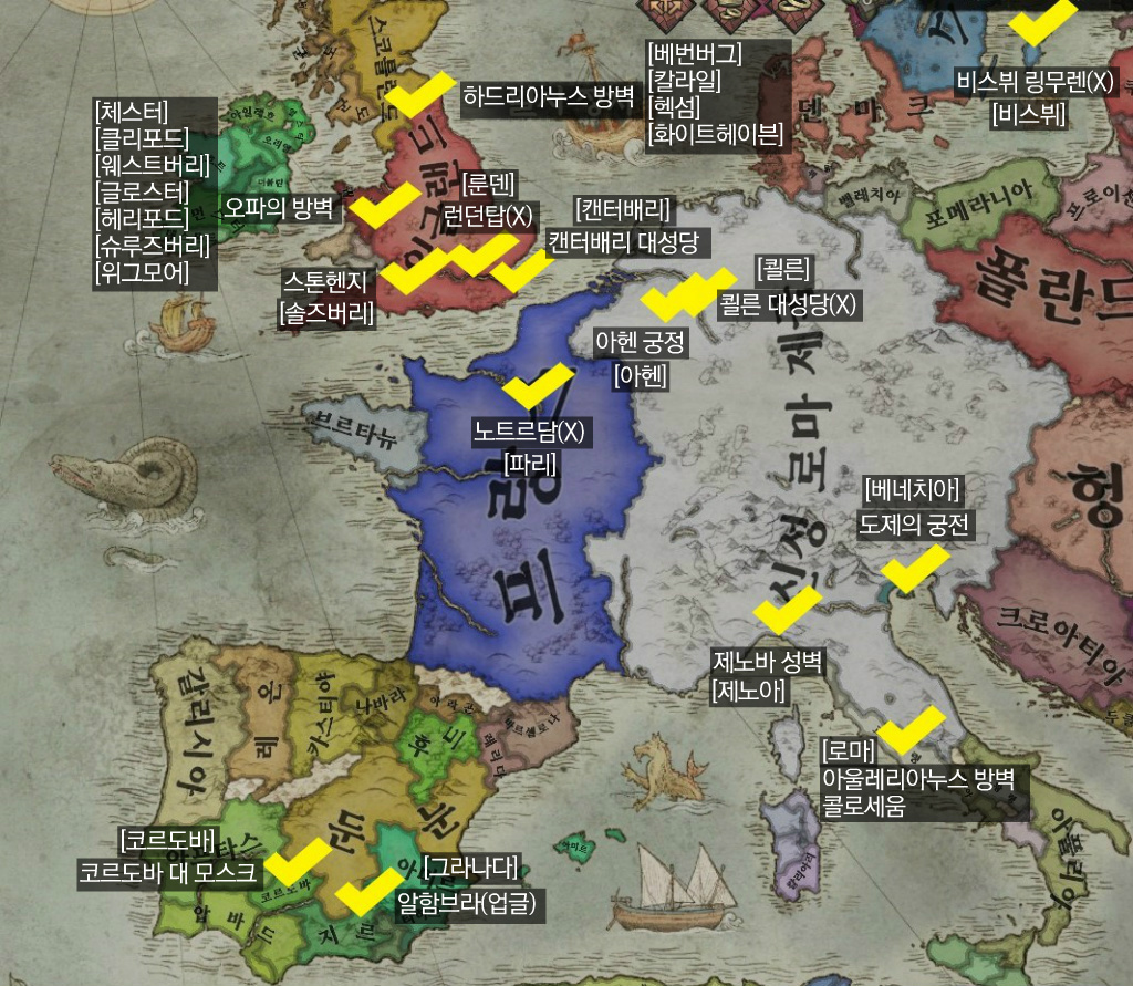 (X): 건설되어있지 않음. (1066): 1066년에만 건설된 상태. [업글]: 업그레이드 가능. [OO]: 위치 남작령
