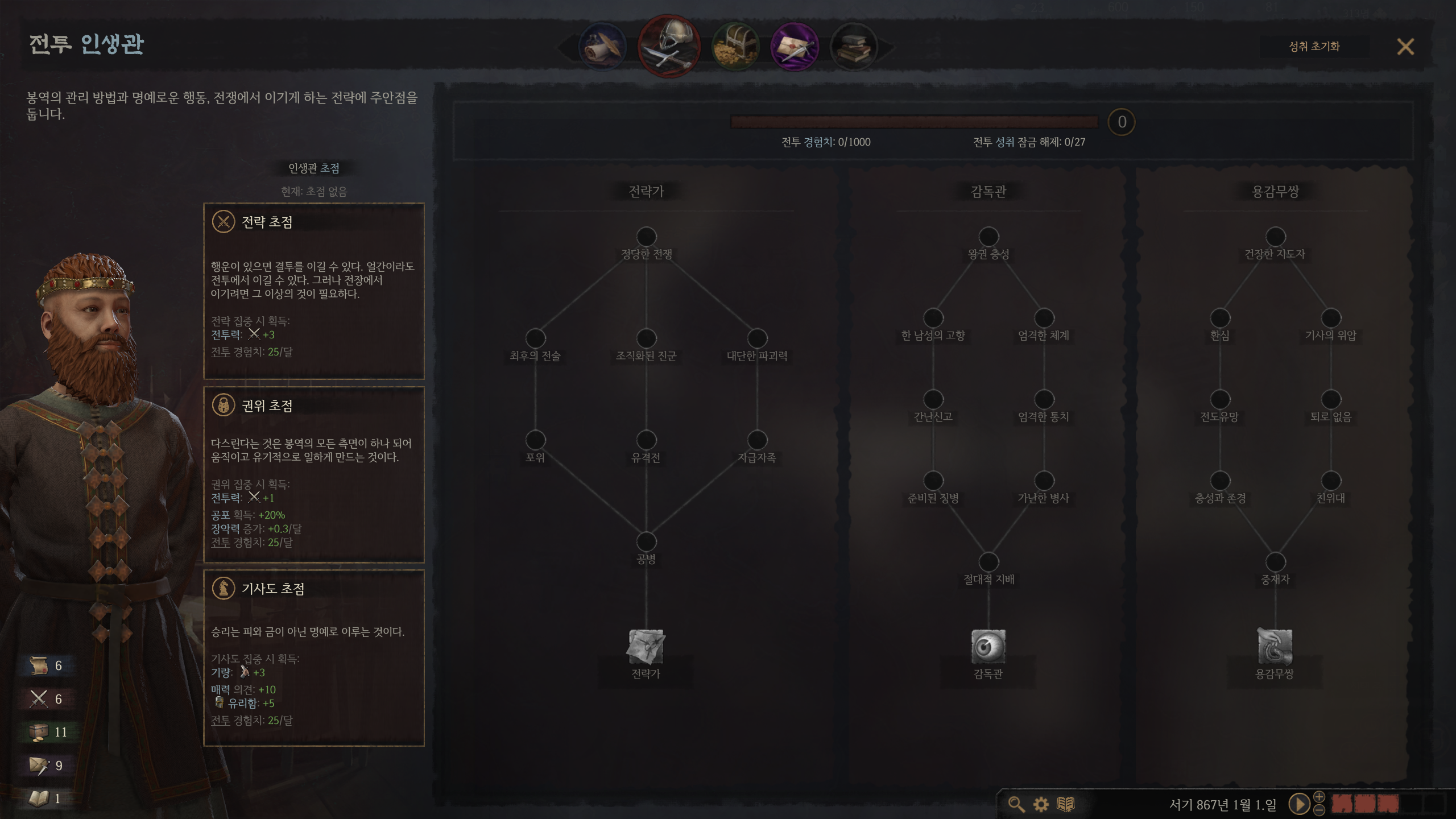(전투 인생관도 앞서 설명드린 외교 인생관과 같이 3개의 초점, 3개의 인생관 계열로 나뉩니다. 초점들은 각각 전투력을 올리는 전략 초점, 공포 획득과 장악력 확보를 돕는 권위 초점, 그리고 기량, 연애, 전투에 능력이 분배된 기사도 초점이 있습니다. 인생관 계열도 이에 비슷하게 전략에 대한 보너스를 주는 전략가 계열, 공포정치와 영지 장악을 위한 감독관 계열, 그리고 멋있는 기사가 되고픈 사람들을 위한 용감무쌍 계열이 있습니다.)