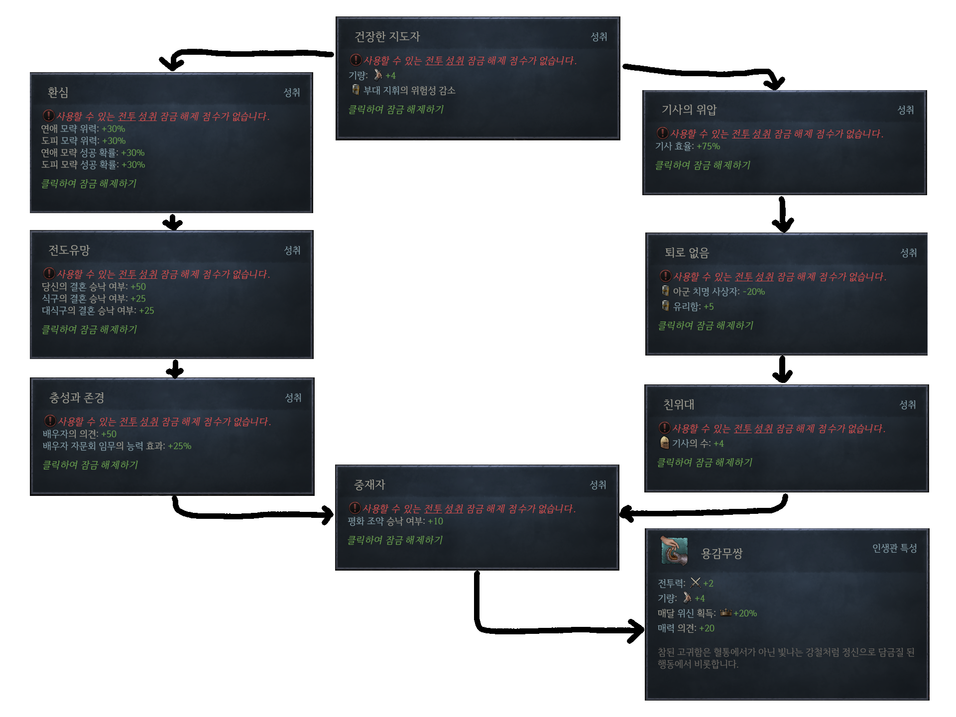 정리하자면 "용감무쌍" 계열에서는 "건장한 지도자"로부터 시작하여 오른쪽 기사 역량 소계열("기사의 위압", "퇴로 없음", "친위대")는 웬만하면 찍는 것을 추천하고, 왼쪽의 연애 소계열("환심", "전도유망", "충성과 존경")은 본인이 원하면 찍어도 무방합니다. 다만 "중재자"와 "용감무쌍"은 인생관을 완성할 생각이 아니라면 굳이 찍을 필요는 없습니다.