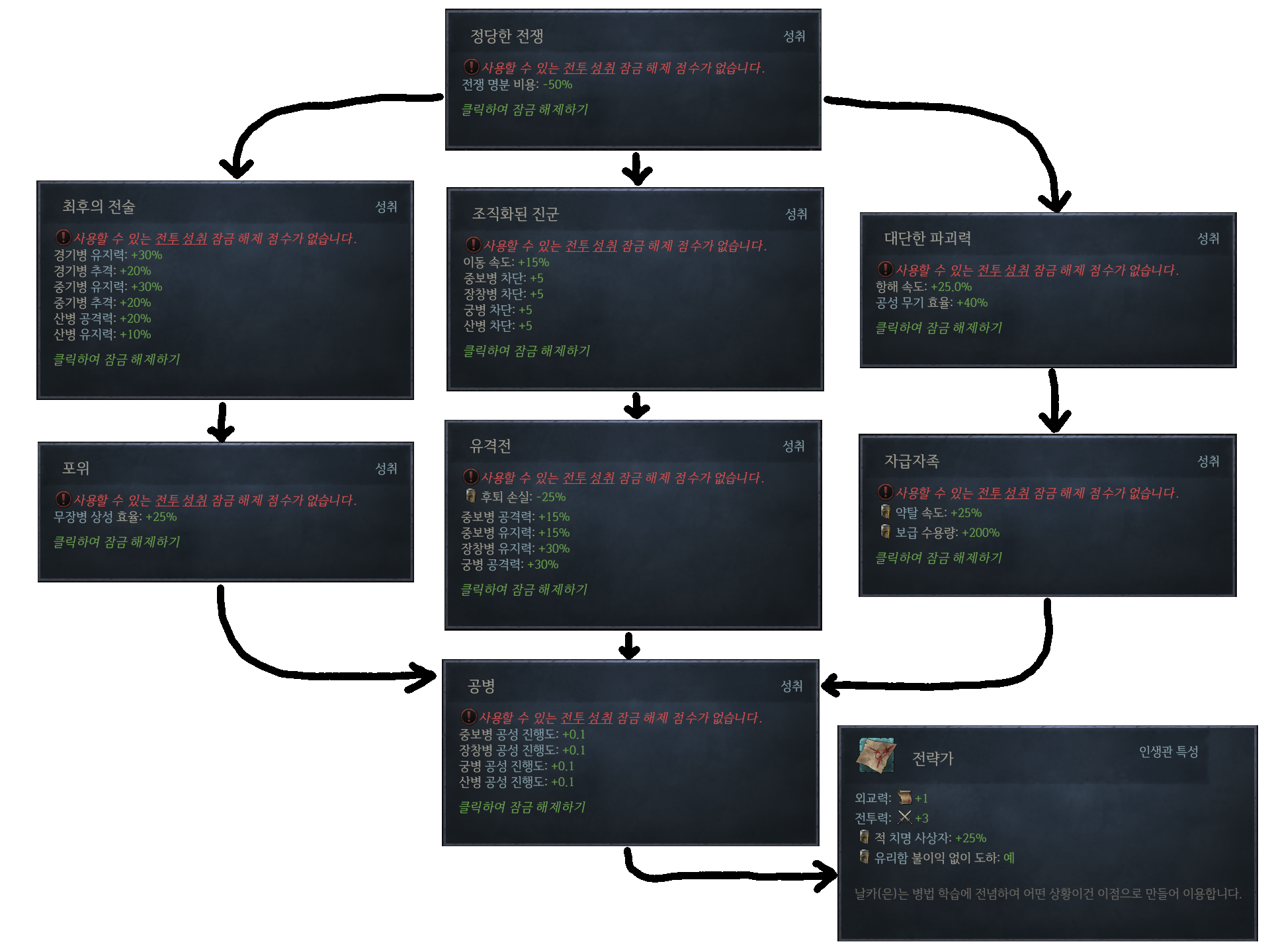 결론을 말씀드리자면, 주는 효과들은 다 밥값을 하지만, 자신의 군대의 어떤 부분을 키울지 생각하고 해당 성취만 찍어도 좋은 계열입니다.