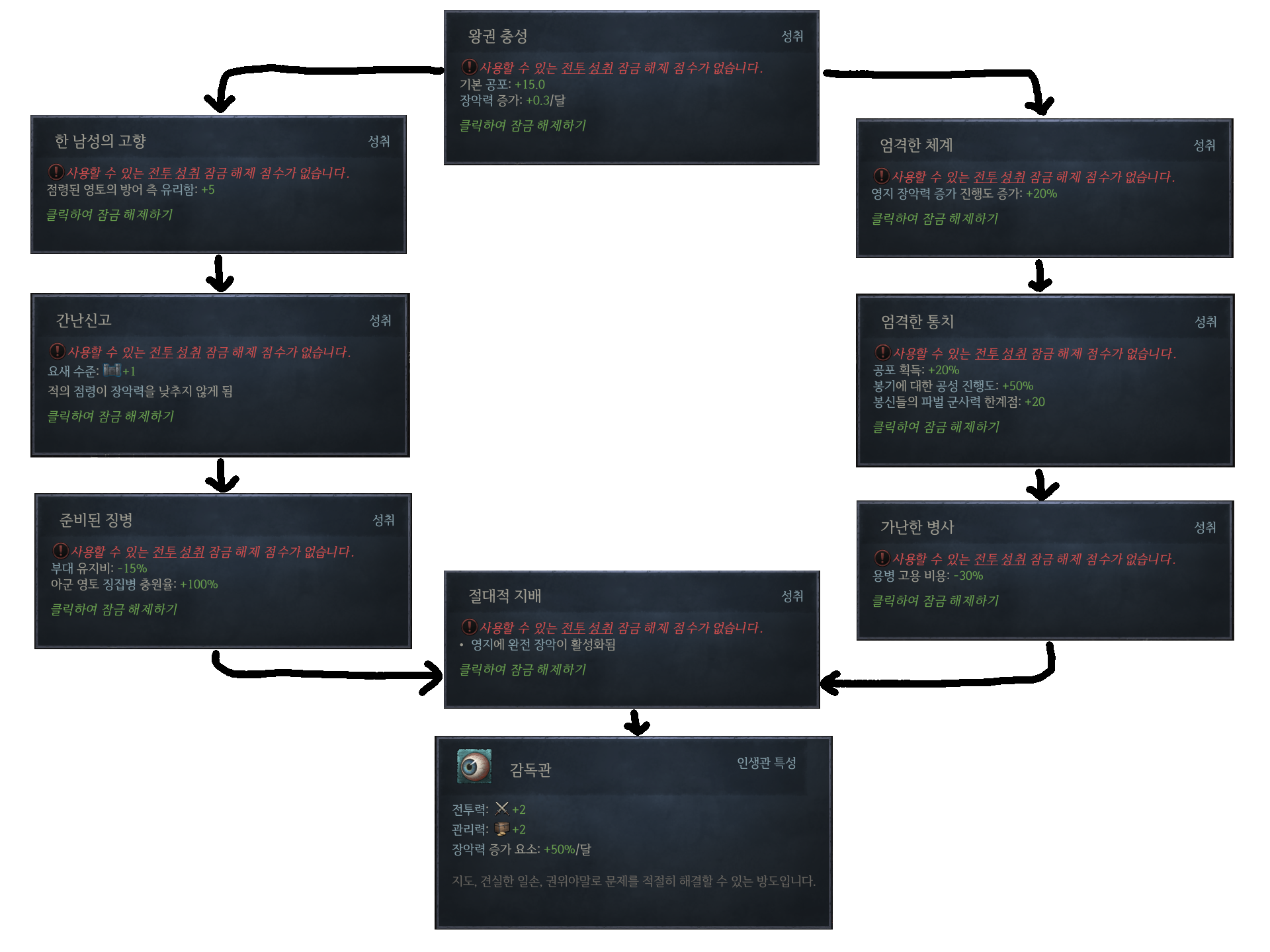 두 소계열을 마무리하면 "절대적 지배"가 있는데 얘는 영지 장악도가 100일 경우 완전 장악이 되어 세금 +5%, 징집병 +10% 보너스를 줍니다. 듣기엔 좋은데 사실 영지 장악도가 100인 경우가 의외로 없어서 완전 장악으로부터 받는 보너스의 양이 생각보다 적습니다. 이 성취를 찍을 바엔 차라리 관리 인생관의 축재자 계열의 성취 몇 개와 바로 옆에 있는 전략가 계열 성취 몇 개를 찍어서 세입도 늘리고 병들의 전투 효율도 늘리는 게 더 도움이 됩니다.