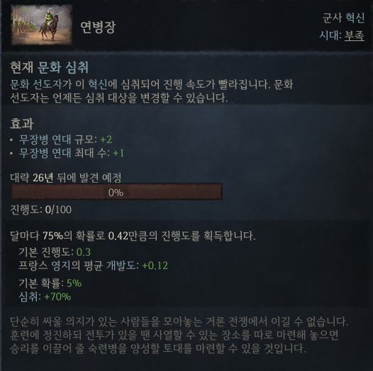 심취 대상으로 선택된 혁신은 문화 선도자의 학습력에 비례(20+학습력x2)한 심취(%)값을 가지게 됩니다.