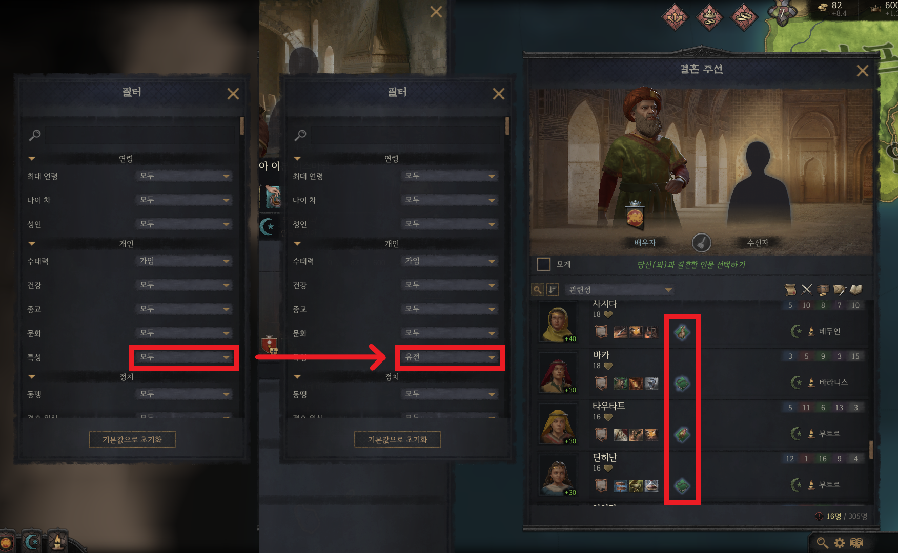 '배우자 찾기' 필터에서 특성 [모두]를 [유전]으로 선택해주면,