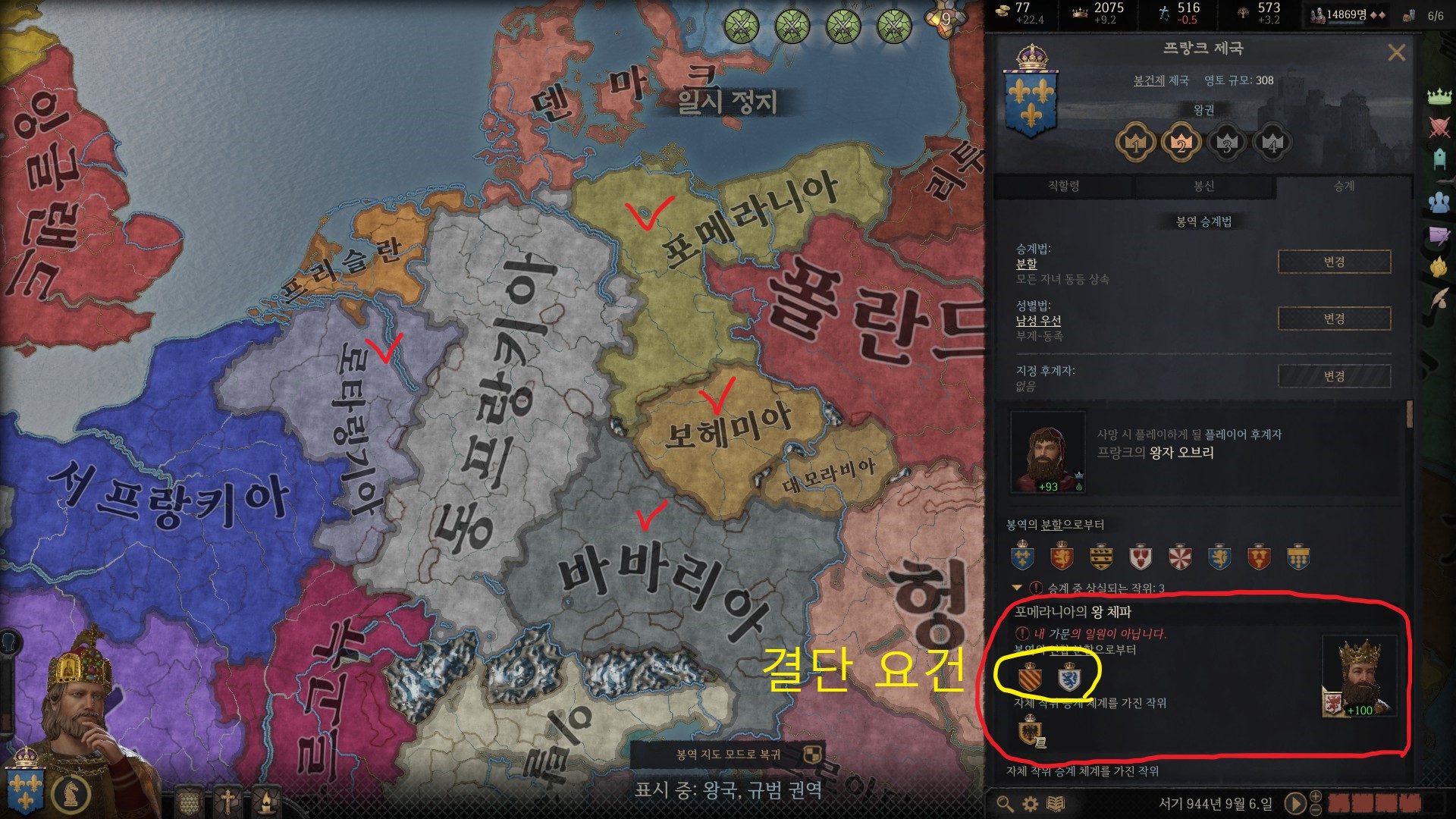 동프랑키아 - 로타링기아 - 바바리아 + 포메라니아 4개 왕작을 전쟁으로 확보한 상태입니다.