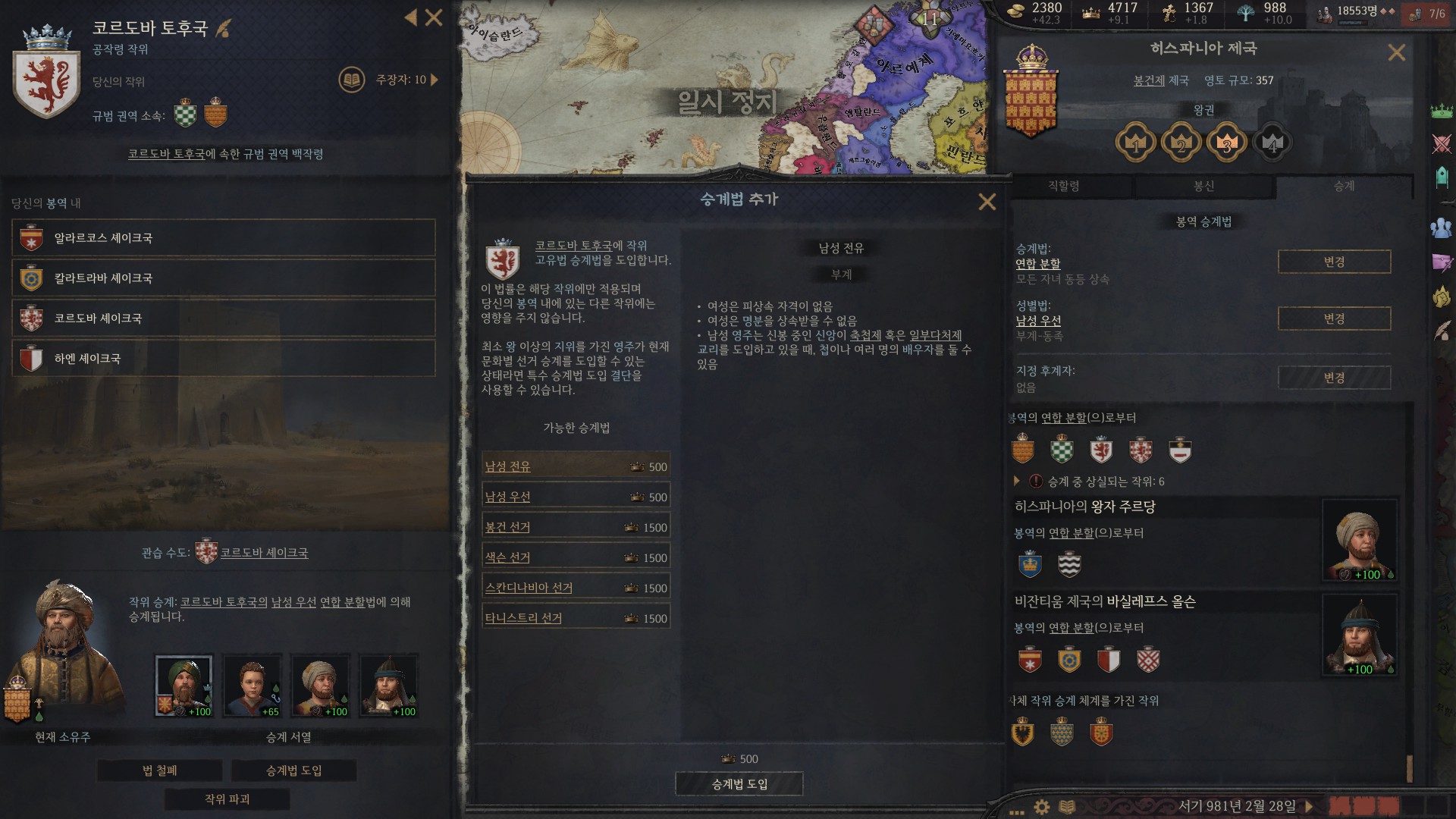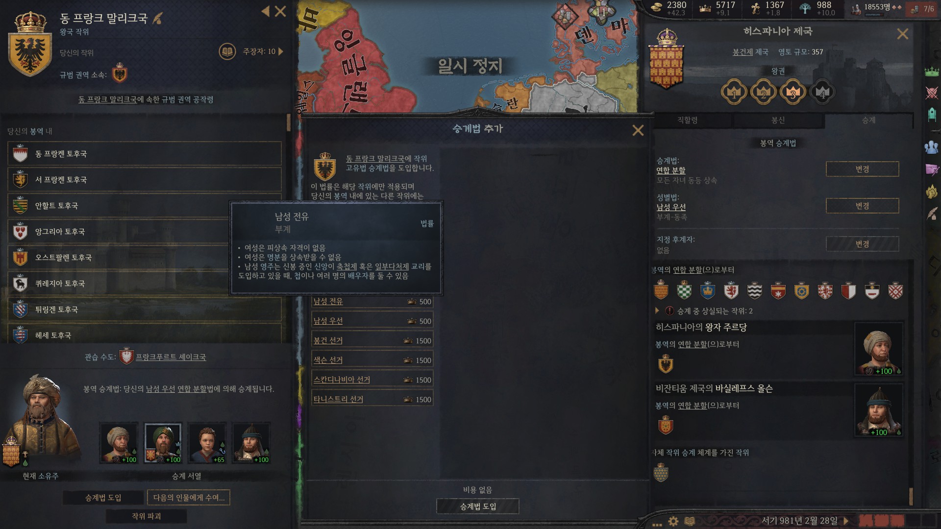 여기서 승계법을 추가해 위신 500 들여서 남성 전유를 선택합니다.