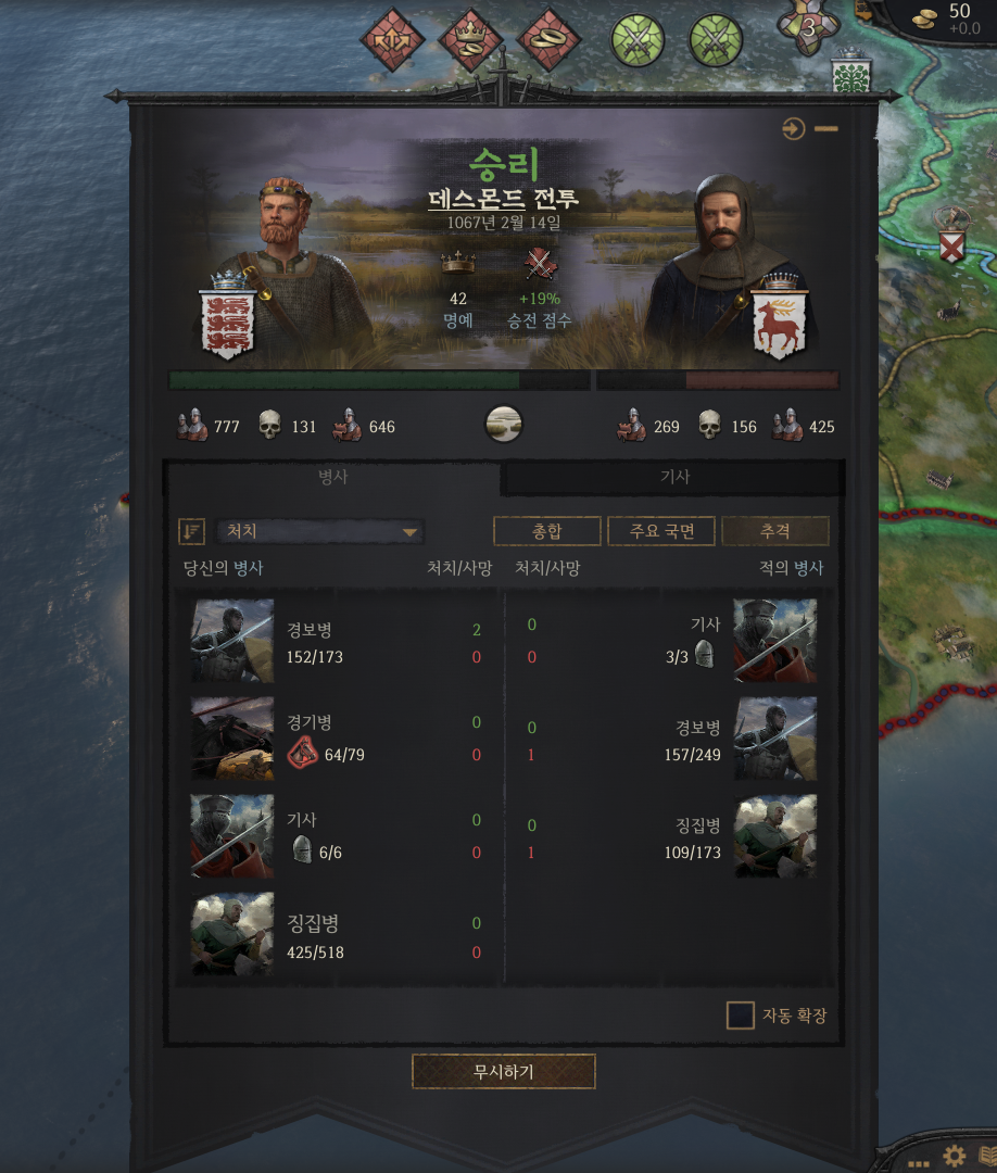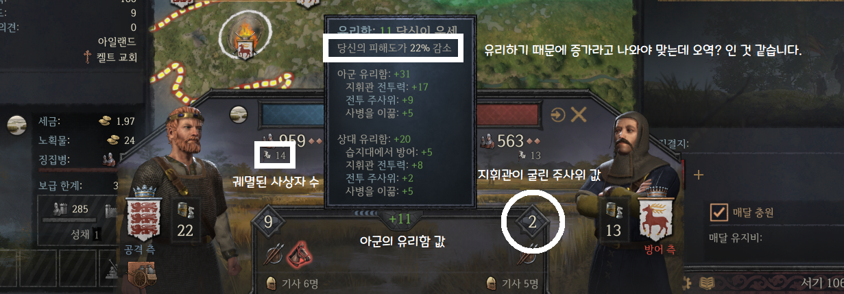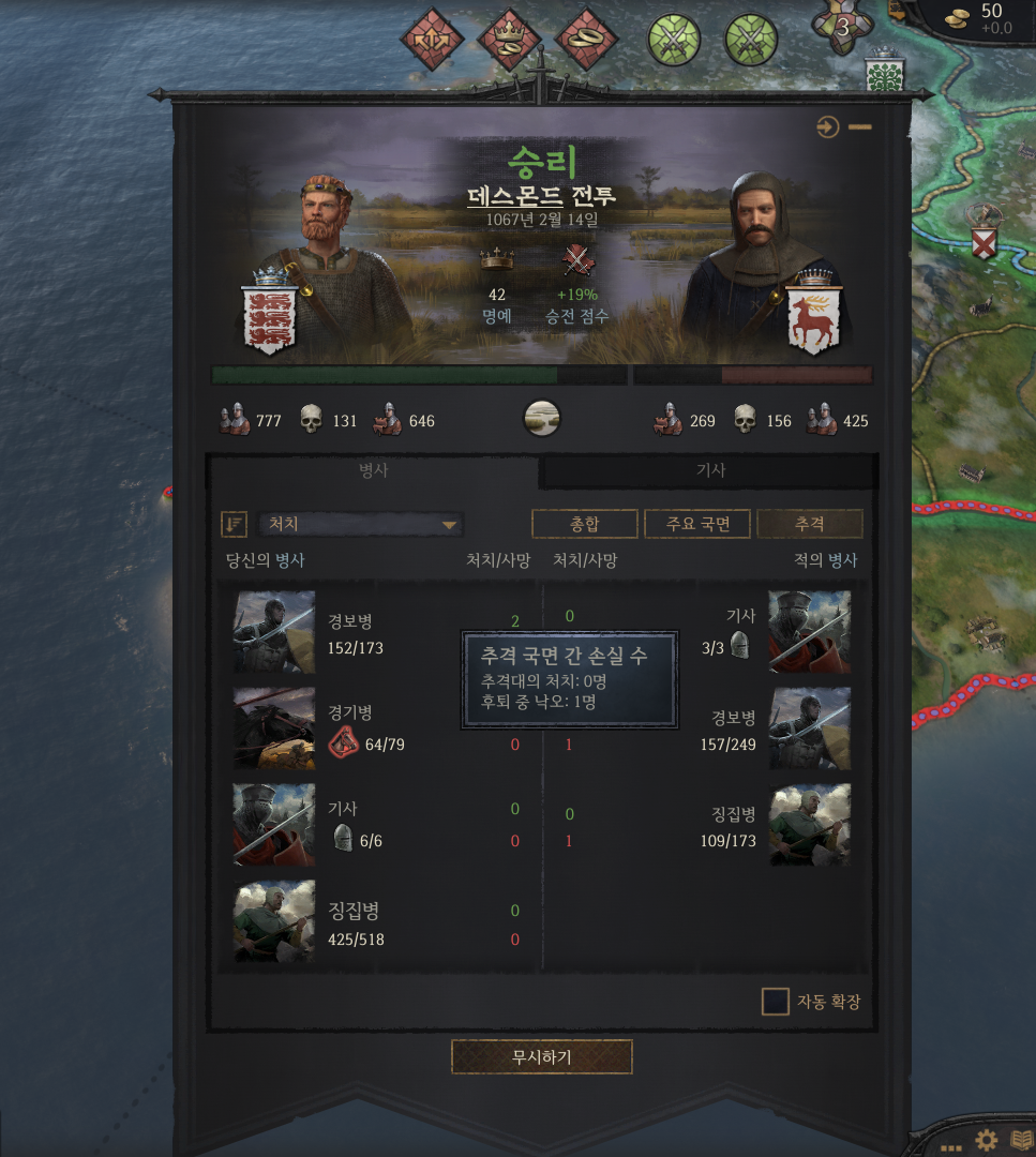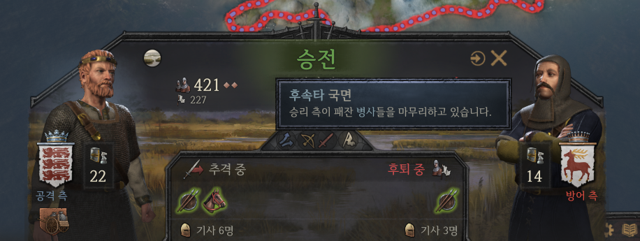 ㄷ. 후기 국면 - 후퇴할 수 있습니다. 후퇴할 경우 잔존 병력은 궤멸된 사상자로 처리됩니다. 수동으로 퇴각하지 않으면 어느 한 쪽이 궤멸할 때까지 전투가 이어집니다.