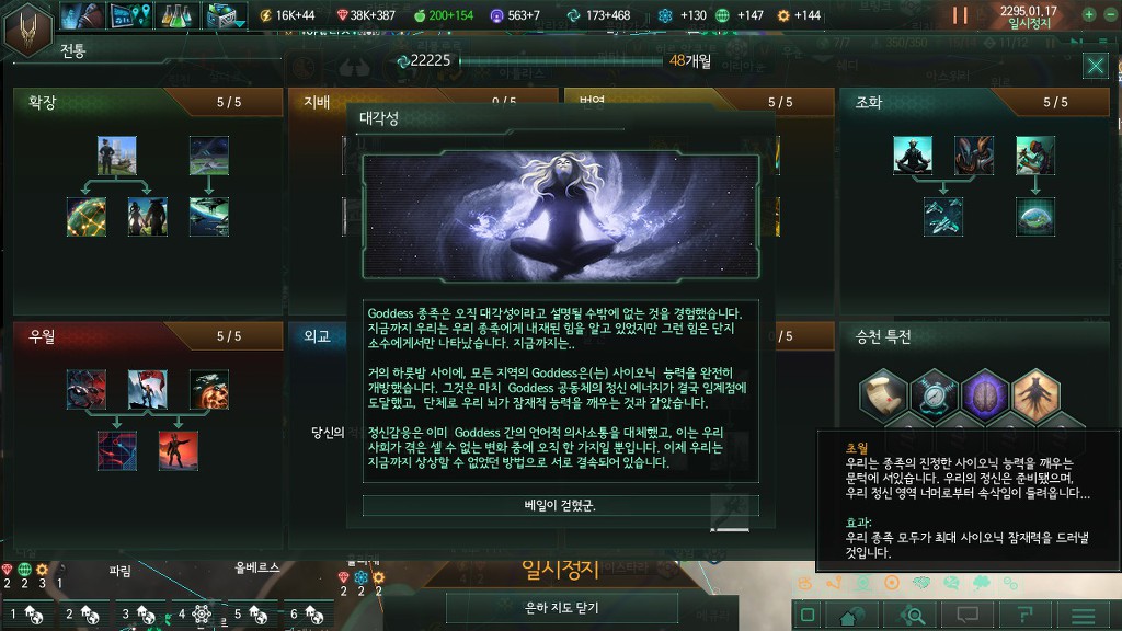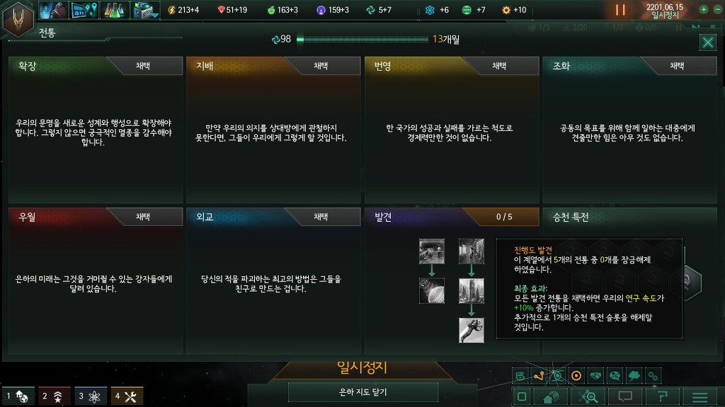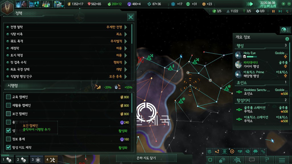 행정활력은 시행령기간을 50%나 늘려주는 사기특전으로 먼저찍고 (은하지도제작 외 시행령은 이 특전은 찍은 후에 찍습니다)