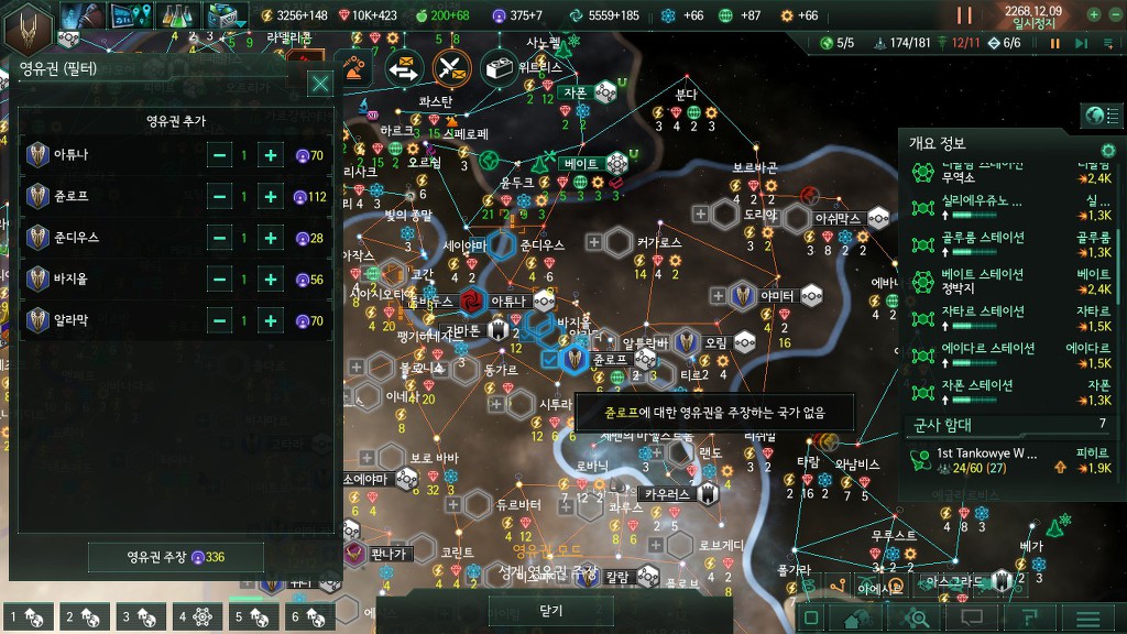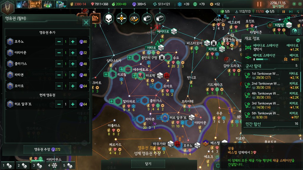 영유권주장은 행성위주로하되, 전략자원이나 영향력비용대비 자원효율이 좋은 항성계도 선택합니다.