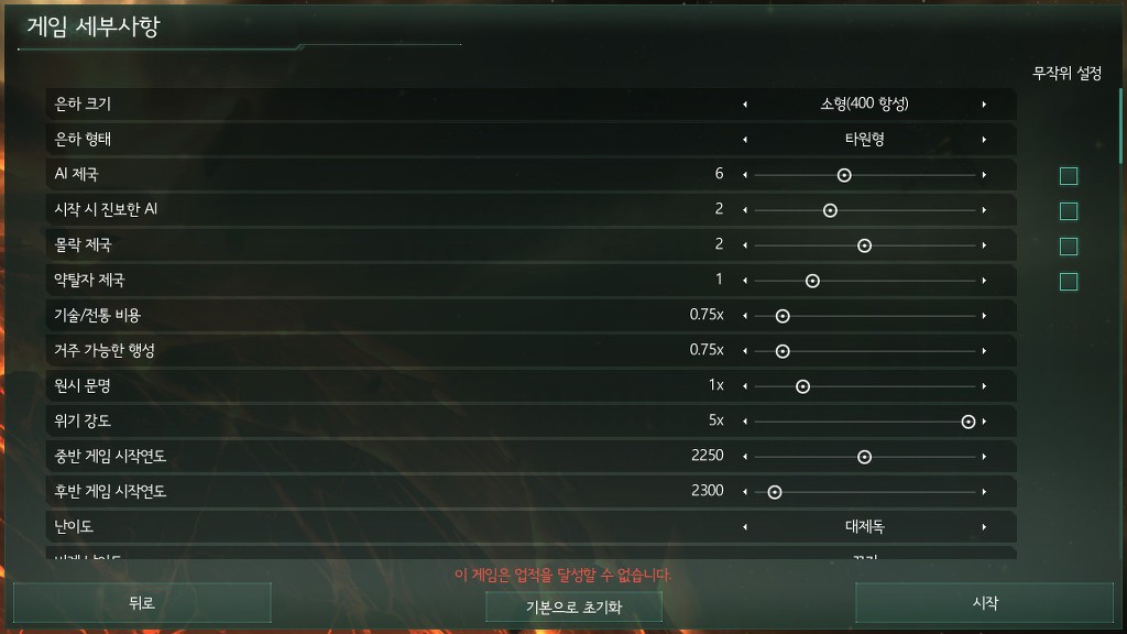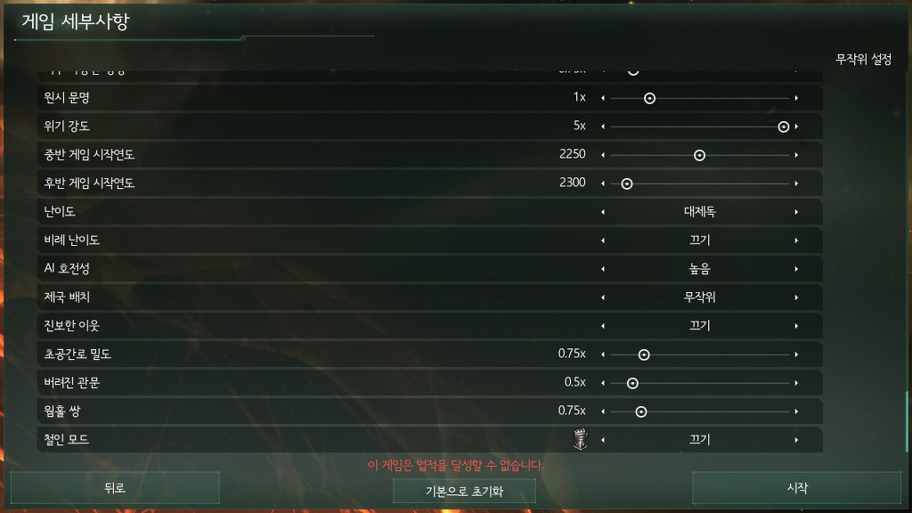 대제독 호전성 높음 등등 바닐라 기준 일반적인 최고난이도 설정입니다.