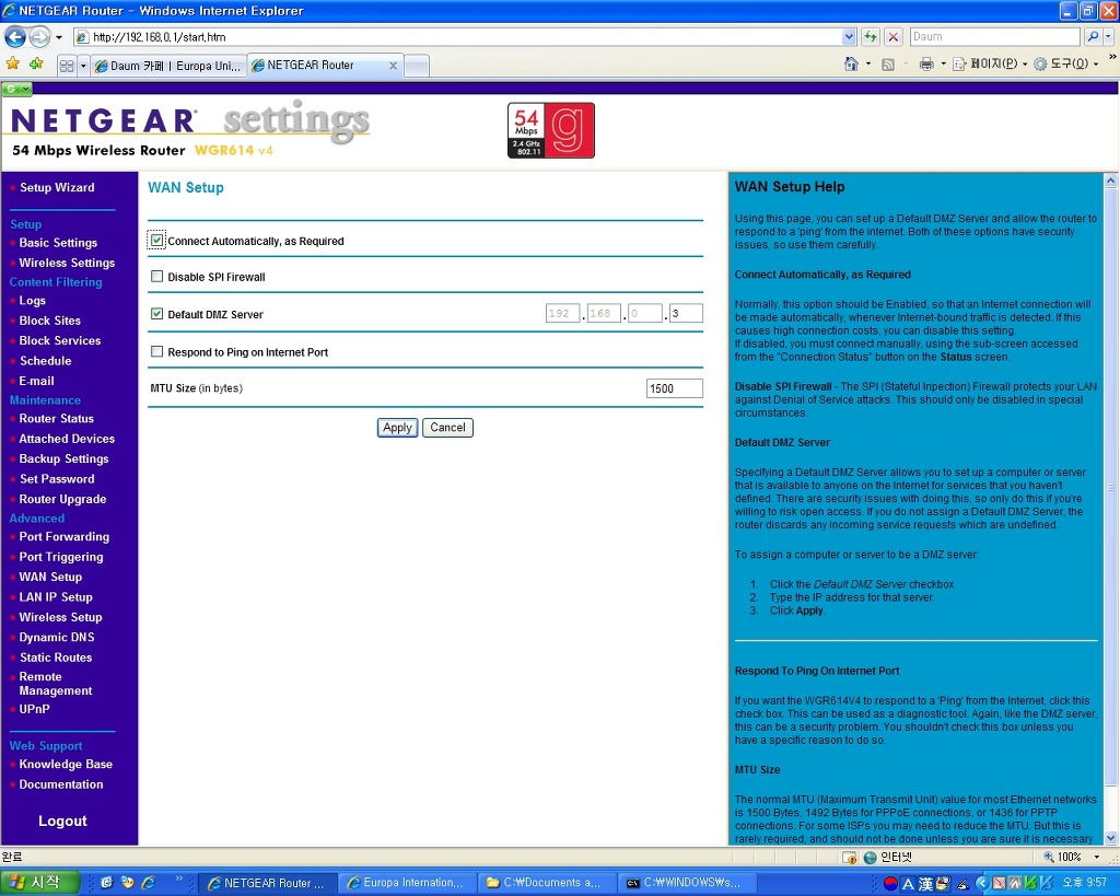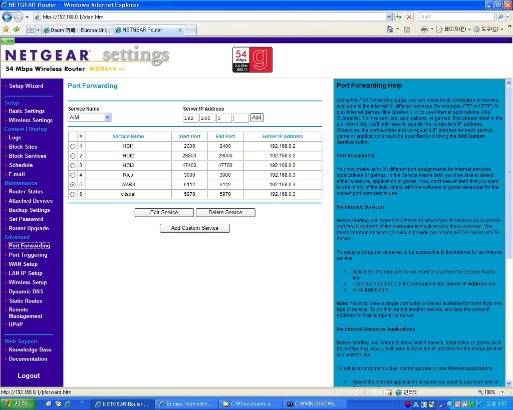 우리가 사용할 기능은 포트 포워딩 (Port Forwarding) 기능, 혹은 DMZ기능을 이용할것입니다.