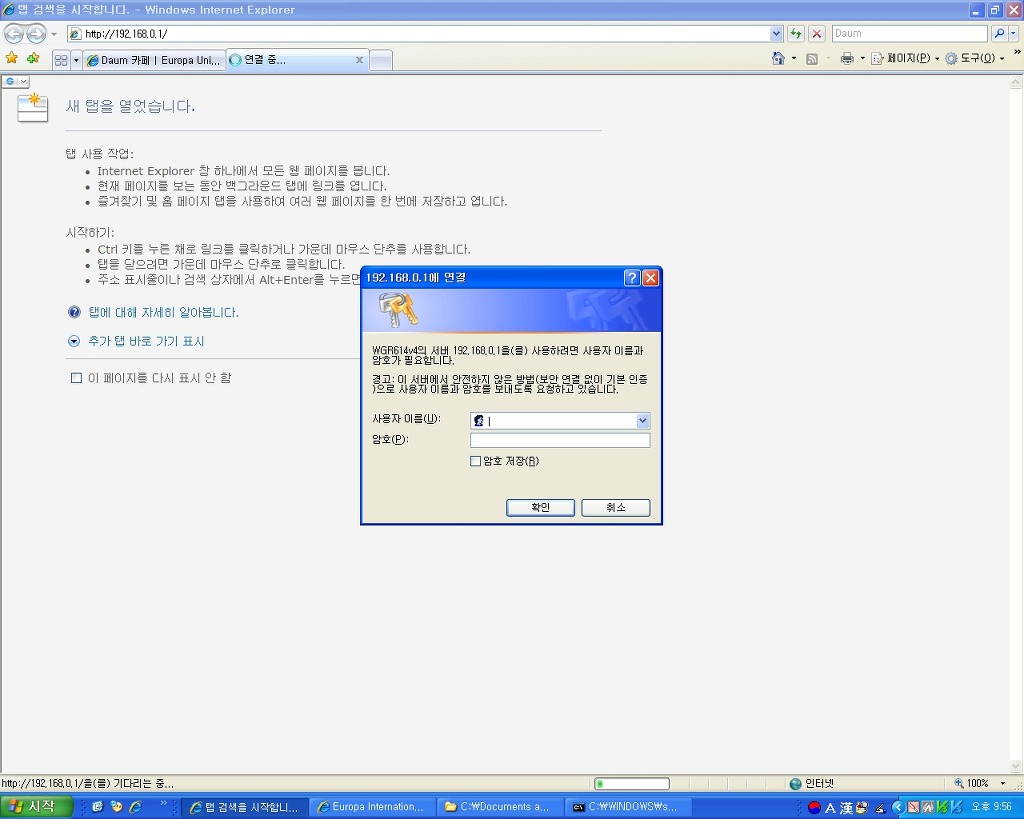 인터넷창을 띄운후 주소창에 Default Gateway번호를 입력합니다(저의 경우 192.168.0.1)