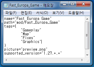 모드 폴더 이름은 앞에서 언급한 대로 path="mod/Fast_Europa_Game"의 Fast_Europa_Game입니다.