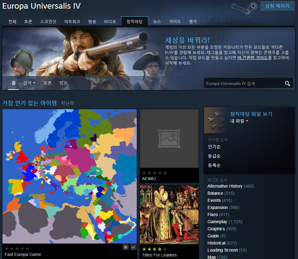 그래도 이제 스팀 창작마당에서 우리나라 사람들이 만든 유로파 모드도 종종 볼 수 있었으면 좋겠어요.