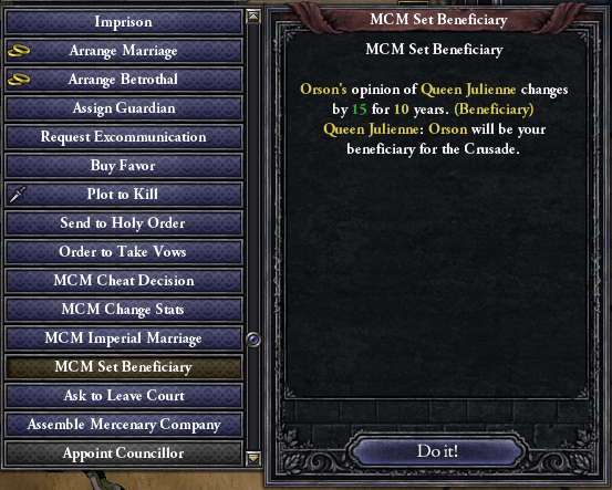 선택한 캐릭터를 자신의 십자군 수혜자로 지정합니다. 가톨릭을 믿는 작위없는 캐릭터여야 합니다.