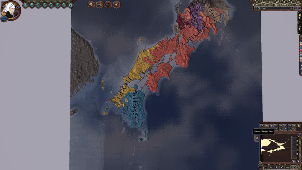 갑자기 오우치가 당주가 죽고 어린아들이 오르자 오우치가에서 반란이 일어났습니다. 반란군 규모가 1만정도였고 오우치가는 7천정도밖에 병력을 움직일수없었는데 이틈을 놓칠수없다! 게다가 지금 3대 시마즈가가 외가가 오우치가 혈통이기 때문에 클레임까지 오우치가를 먹을수 있죠. 이런 큰그림까지 그리지는 않았는데 원래 이 3대 후계자는 능력치가 딸려 버리려고했는데 능력치 좋은 장남이 갑자기 우울증으로 죽는바람에 차남을 3대 후계자로 내새웠습니다. 클레임덕분에 당주에 올렸네요! 결국 동맹을 맺은 호소카와와 함께 오우치가를 쳤습니다.