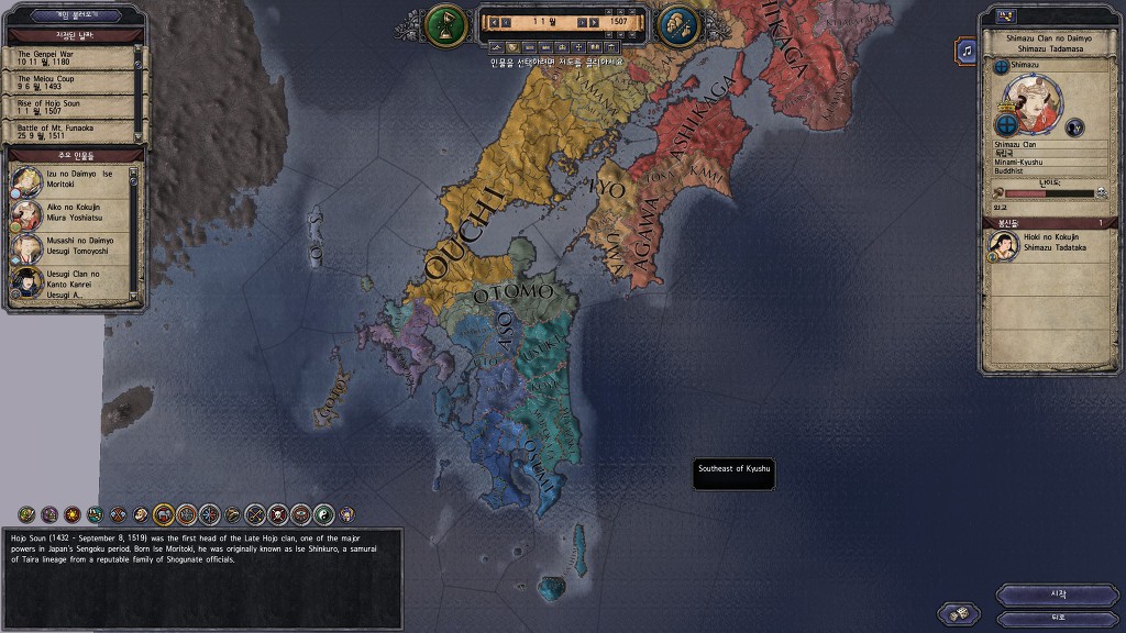 일단 가장 위협적인게 오토모와 오우치가 정도네요 플레이하니 다른 가문들도 적극적으로 전쟁을 통한 확장을 많이해서 저도 위기감을 느끼고 규슈 남쪽부터 빠르게 정리하기로했습니다.