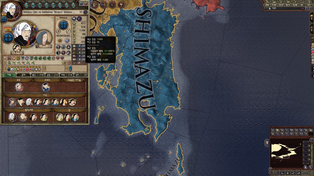 2대째 자식플레이 중 50년째 정도에 규슈 2/3정도는 확보했습니다. 단지 오우치가의 엄청난 기세로 위로 뚫지 못하겠더군요. 실제 병력 비교를 했는데 시마즈가와 오우치가가 비슷하기는 합니다. 하지만 영지수입(돈에서 상대가 안되더군요. 용병고용해서 싸운다해도 1:1로는 이기기 힘들것같더군요)그래서 10~20년은 영지 개발 및 안정화로 자금 확보하는 기간이었습니다. 전쟁후 평화의 시기 그리고 또 전쟁 반복...